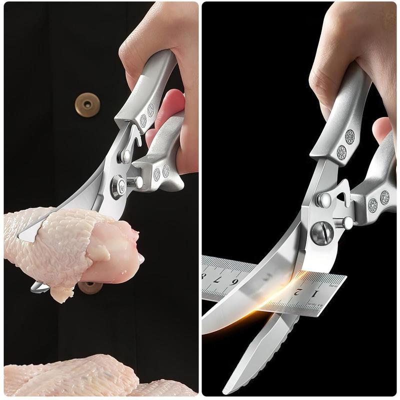 Premium, Ultra-Sharp Poultry Shears: Forged from high-quality stainless steel for extra sharpness and strength, these shears feature exceptionally sharp blades, including a serrated edge perfect for scalers.These shears easily cut through poultry, turkey wings, and fish without slipping, making them essential kitchen tools.