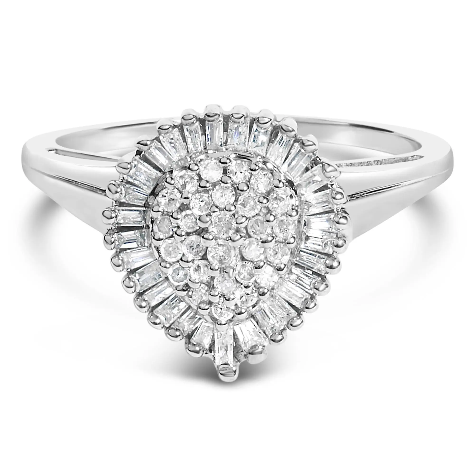 10K White Gold 1/2 Cttw Round & Baguette Cut Diamond Pear Shaped Domed Pavé Cluster with Halo Cocktail Ring (H-I Color, SI1-SI2 Clarity)