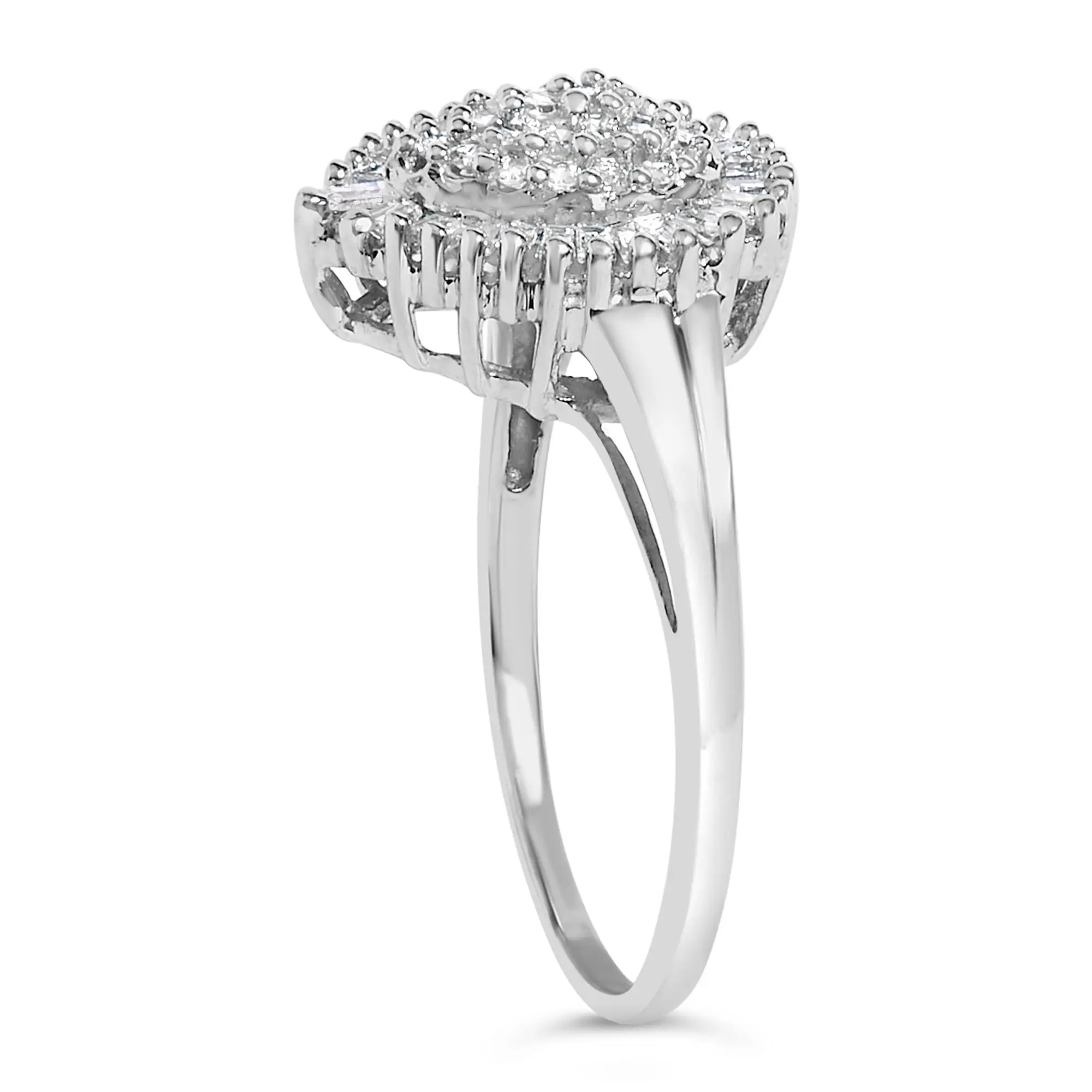 Elegant and timeless, this gorgeous 10K white gold diamond cocktail ring features 1/2 carat total weight of diamonds with a whopping 56 individual stones. The fashion ring features a domed pear-shaped cluster pavé set with round, brilliant cut white diamonds ensconced in a halo made up of rectangular, baguette cut diamonds. The floral cluster is centered on an asymmetrical tapered band that is remarkably slender. The cathedral style ring has a decorative openwork cutout gallery. This classic, feminine cocktail ring makes a great gift for any special occasion! Whether worn for daytime glamour or evening sparkle, this cocktail ring is gorgeously versatile. Give her a gift that will perfectly complement her favorite ensemble.