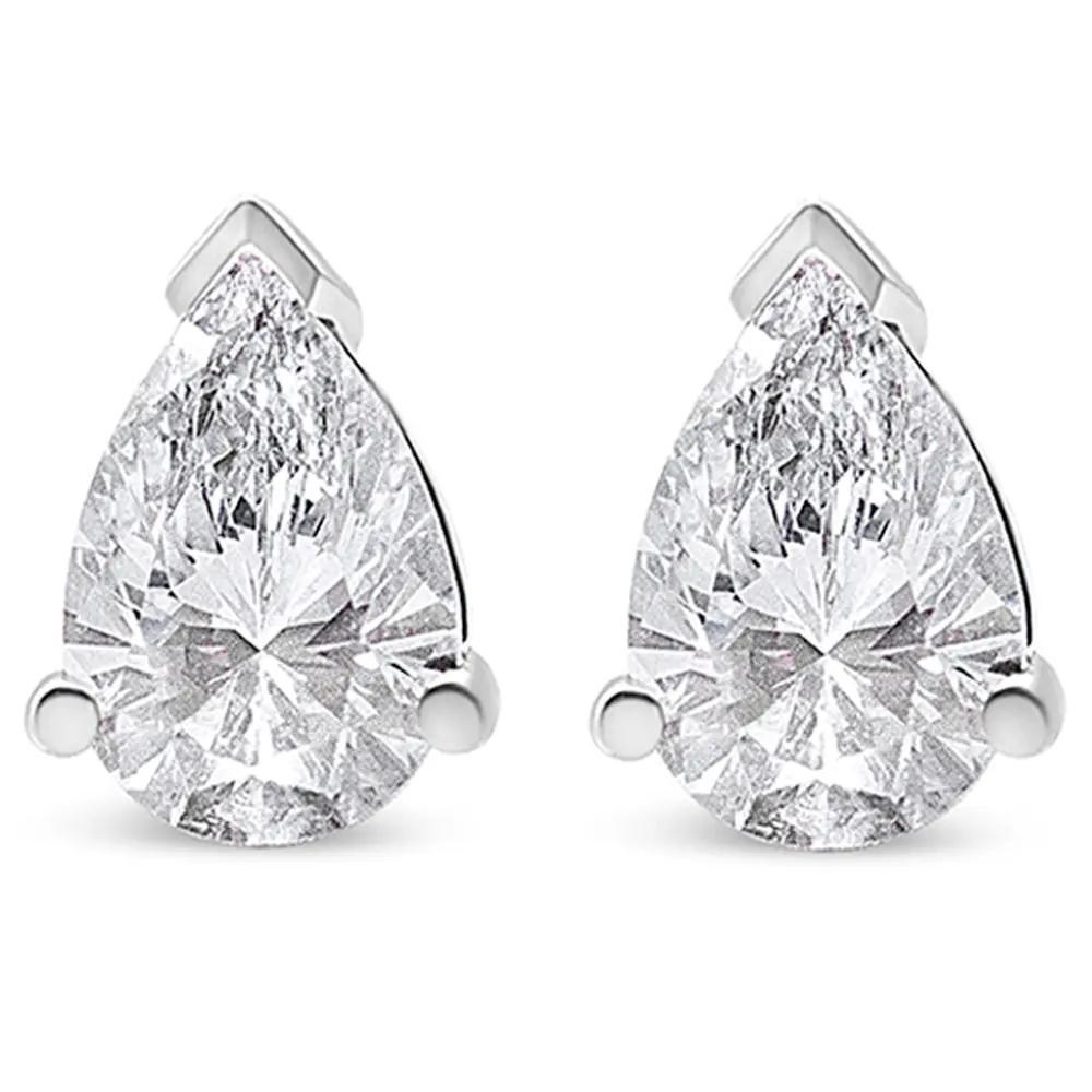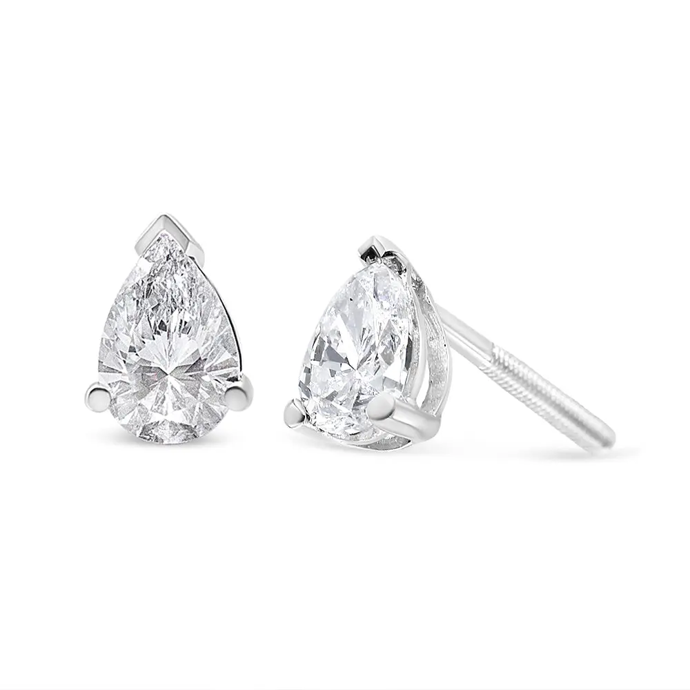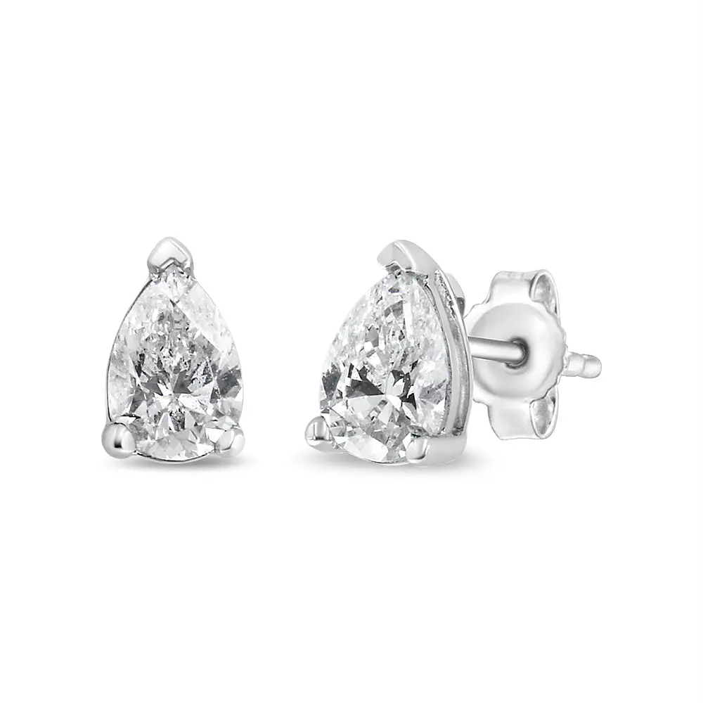 A timeless jewelry essential, these white diamonds studs will bring unparalleled sparkle to your ears. These elegant lab grown diamond stud earrings feature a 3-prong prong setting in a glistening 14k white gold metal. The 2 round, brilliant lab-grown diamonds radiate a beautiful white sparkle as they float within the three-prong setting of these 14k white gold stud earrings. Each lab-grown diamond is crafted to the highest standards and has a VS2-SI1 clarity grade. The studs include dazzling pear-cut lab grown diamonds with a total weight of 1/2 carat and come with a push-back clasp for a secure and comfortable fit.