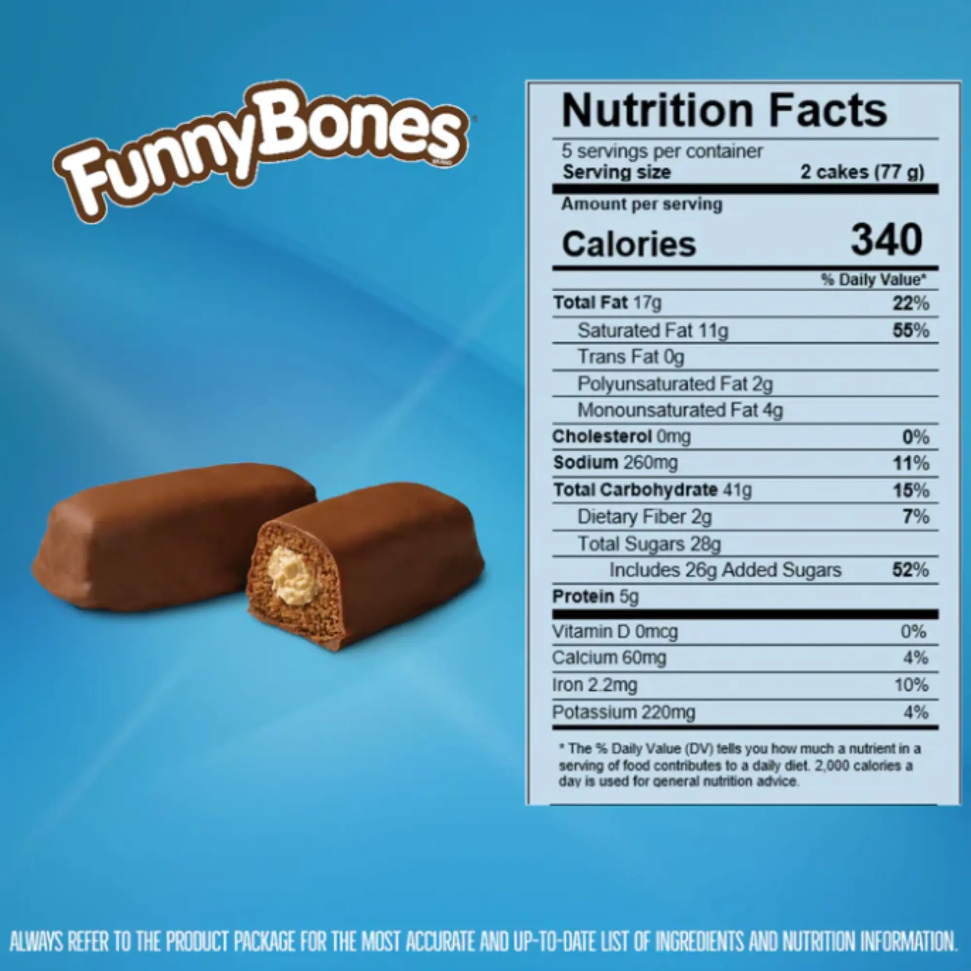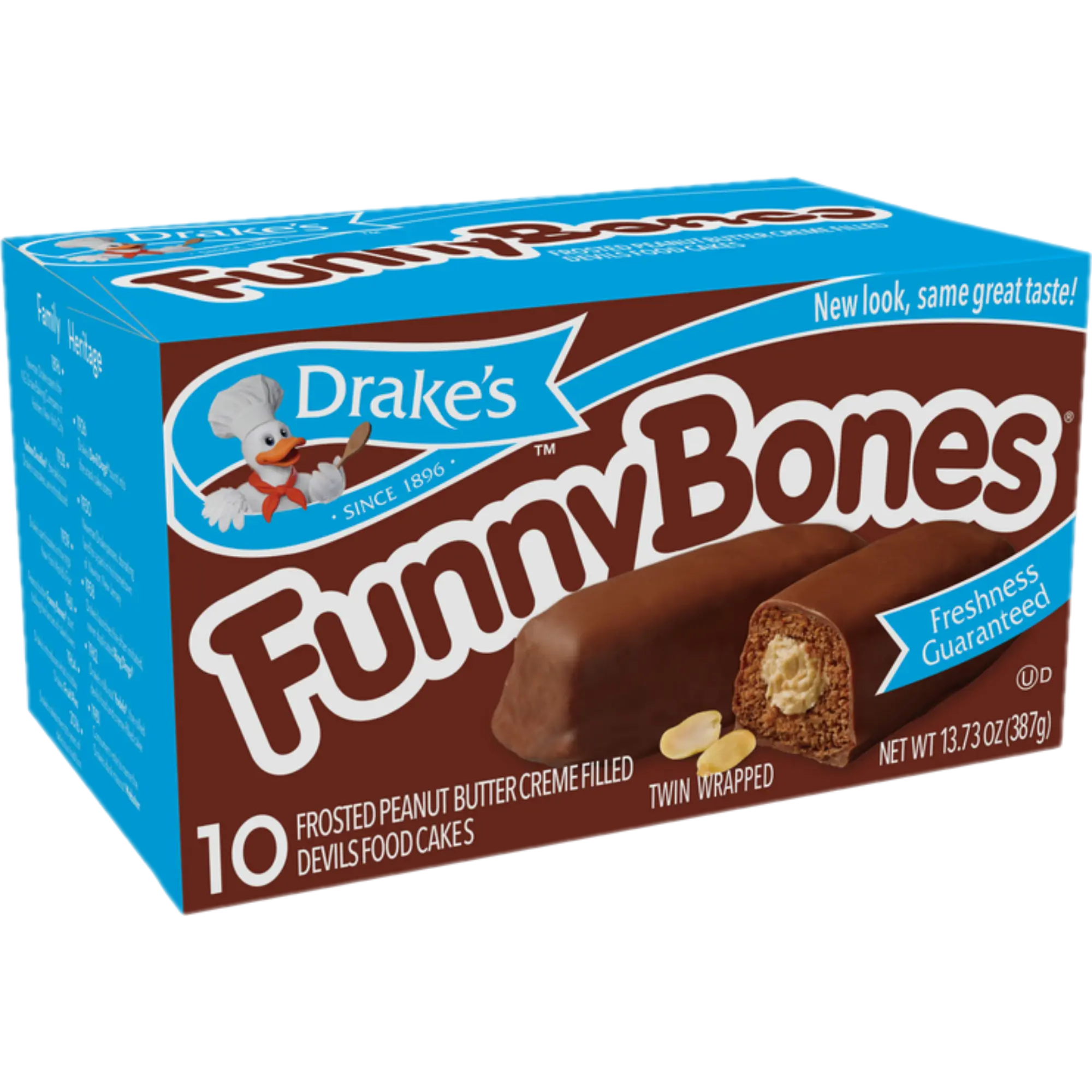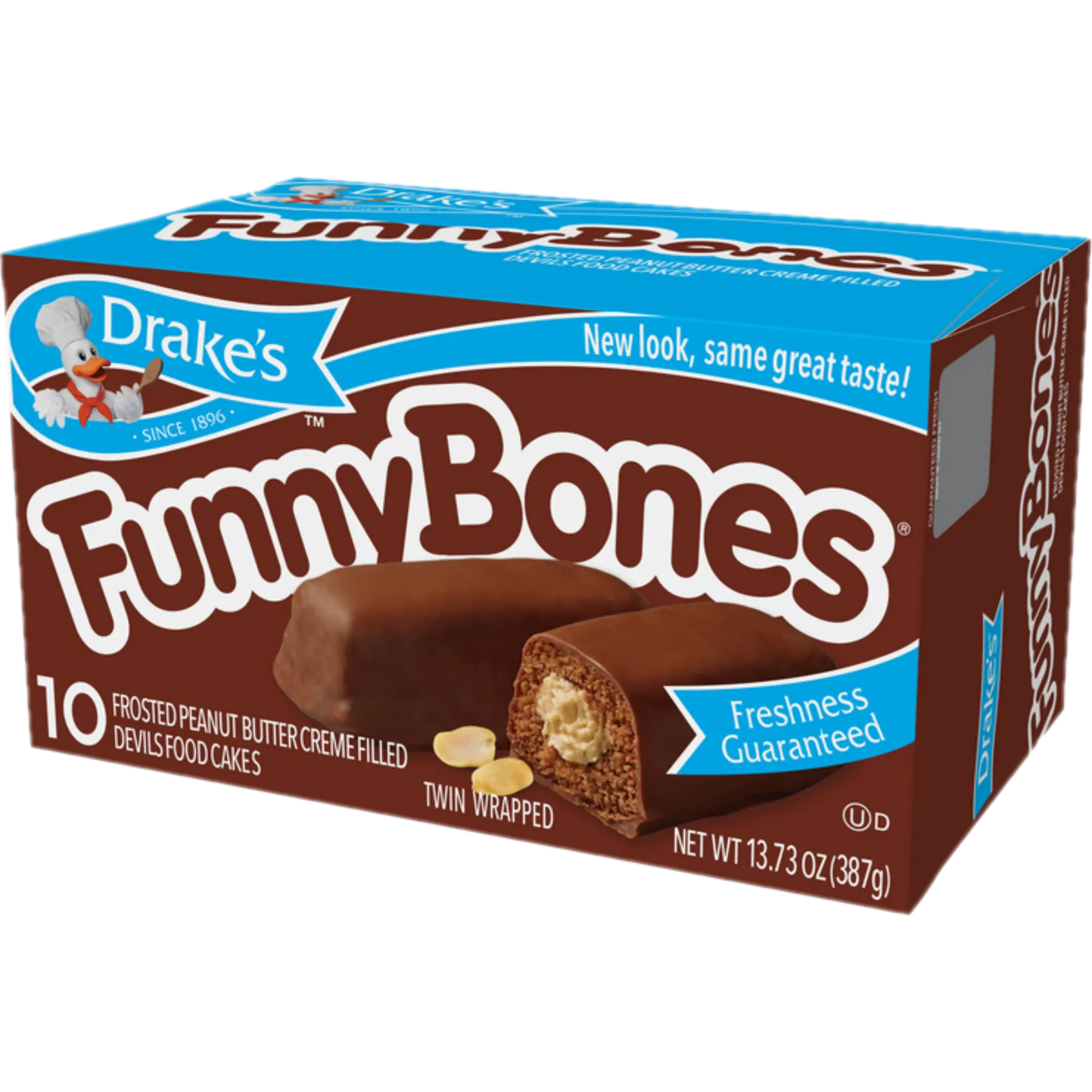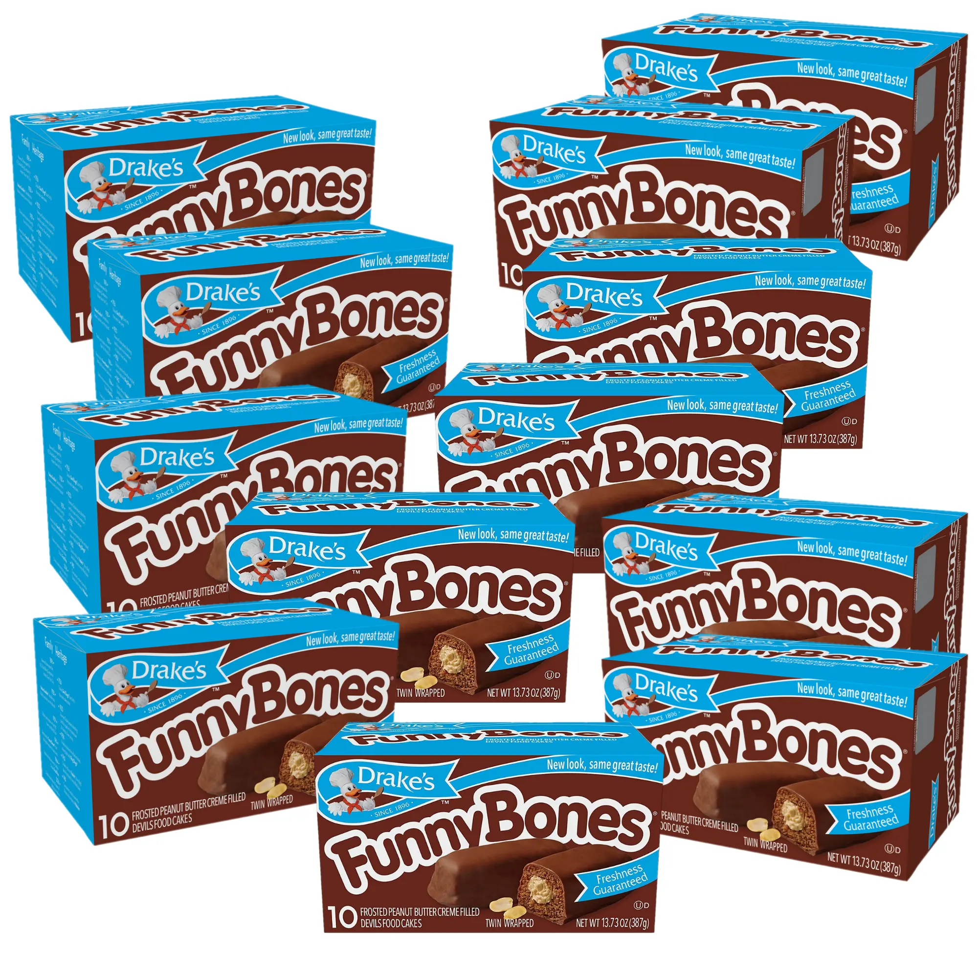 Drake's Funny Bones are chocolate snack cakes made with soft devil's food cake and a rich peanut butter creme center. This 12-box pack includes 120 twin wrapped cakes, making it a practical choice for families, offices, break rooms, parties, lunch packing, and stocking up on a sweet dessert snack.