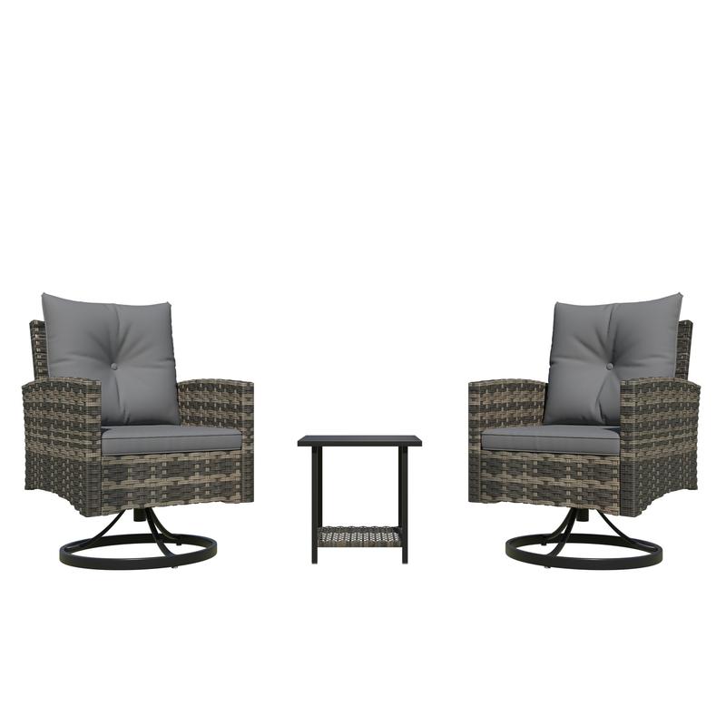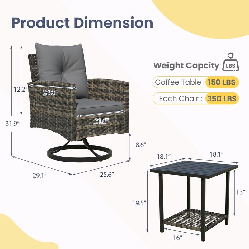 Handwoven with high-quality, UV-resistant PE rattan and supported by a powder-coated steel frame, this outdoor swivel chair set is built to withstand sun, rain, and daily outdoor use. The durable wicker resists fading and cracking for long-lasting beauty.