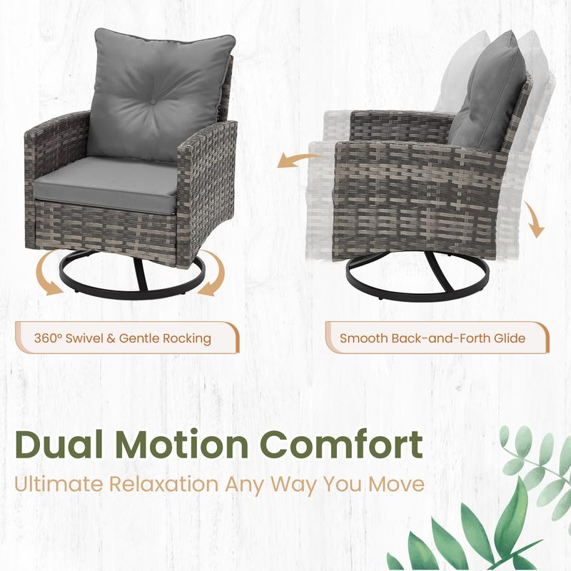 Enjoy effortless movement with smooth 360° swivel and gentle rocking motion. The rotating base allows you to turn freely for conversations or relaxation, making these swivel rocker chairs perfect for lounging, entertaining, or enjoying a quiet coffee outdoors.