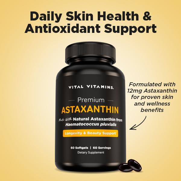Vital Vitamins Astaxanthin 12mg Softgels deliver high-potency natural astaxanthin sourced from microalgae (Haematococcus pluvialis)—one of the richest plant-based sources of this powerful antioxidant.