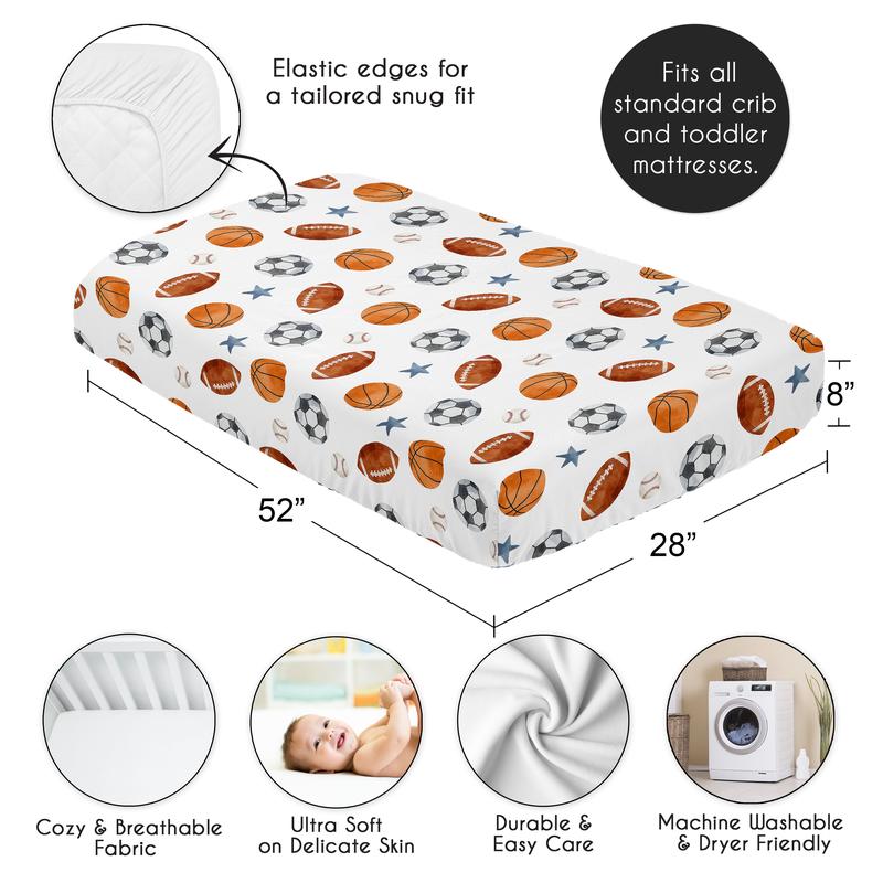 Sweet Jojo Designs crib sheets are designed to match with their coordinating Crib Bedding Sets. Made with soft and cozy fabrics in exclusive patterns and colors. Sweet Jojo Designs crib sheets add a stylish look to your nursery. Dimensions: 52in. x 28in. x 8in. Brushed Microfiber - Watercolor Vintage Sports Theme Soccer Balls Football Baseball Basketball Blue Stars Sport Themed Print Fully elastic bottom for secure fit on most standard size cribs and toddler beds Easy machine washable and dryable Love the fabric style? Sweet Jojo Designs also makes coordinating bedding and decor accessories.