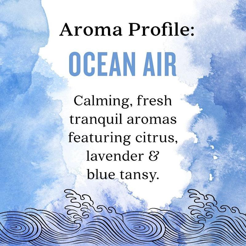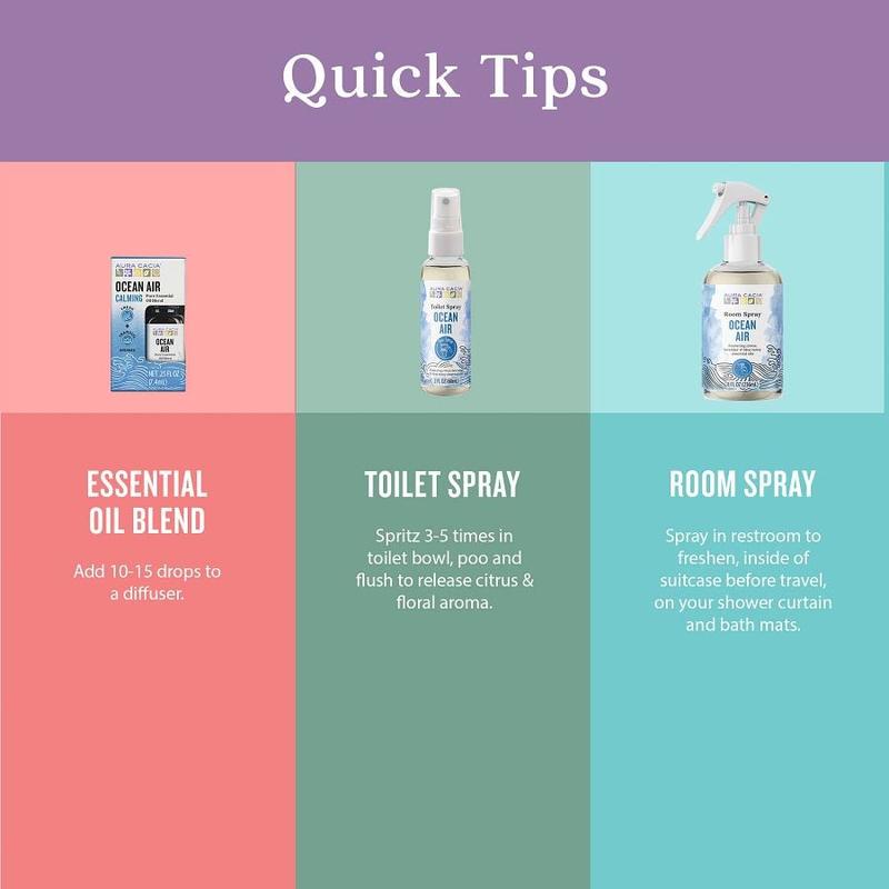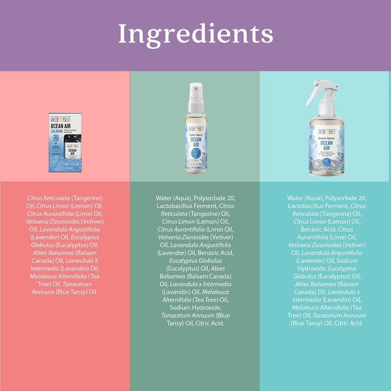 Ocean Air Room Spray (8 fl oz), Ocean Air Essential Oil Blend (0.25 fl oz), and Ocean Air Toilet Spray (2 fl oz).