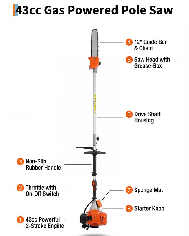 · 【Powerful & Efficient Cutting Performance】-Experience professional-grade power with our 43cc 2-stroke engine. This gas pole saw delivers a fast 49.2ft/s chain speed, cutting through 10-inch thick limbs in about 8 seconds for effortless tree trimming. Its high torque ensures consistent performance, making quick work of your toughest pruning jobs.