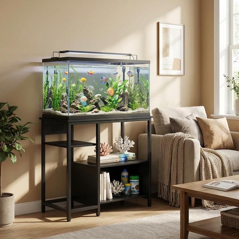 · Built-In Power Outlets for Hassle-Free Setup: This 40-50 gallon fish tank stand comes with integrated power outlets, making it easy to connect filters, air pumps, and lighting for your aquarium or reptile habitat. Enjoy an organized and efficient setup in your living room, office, or bedroom