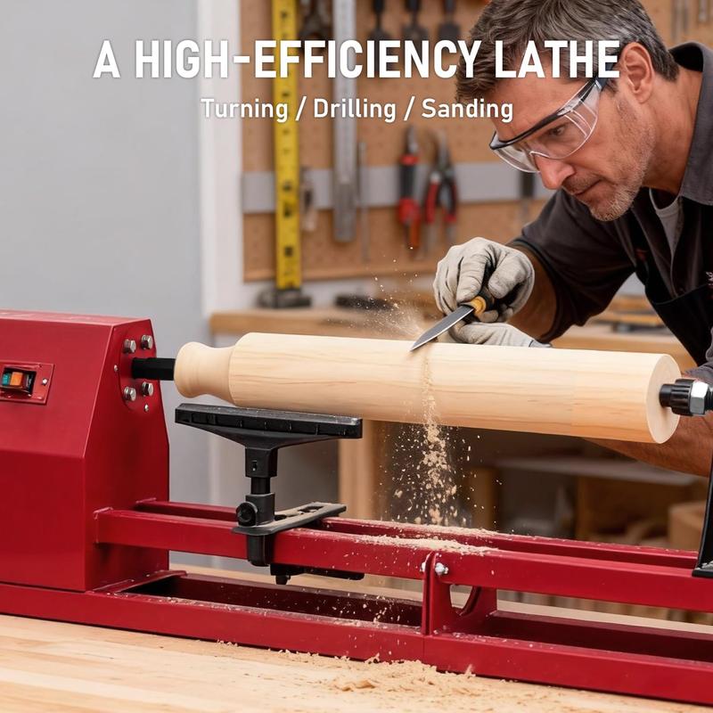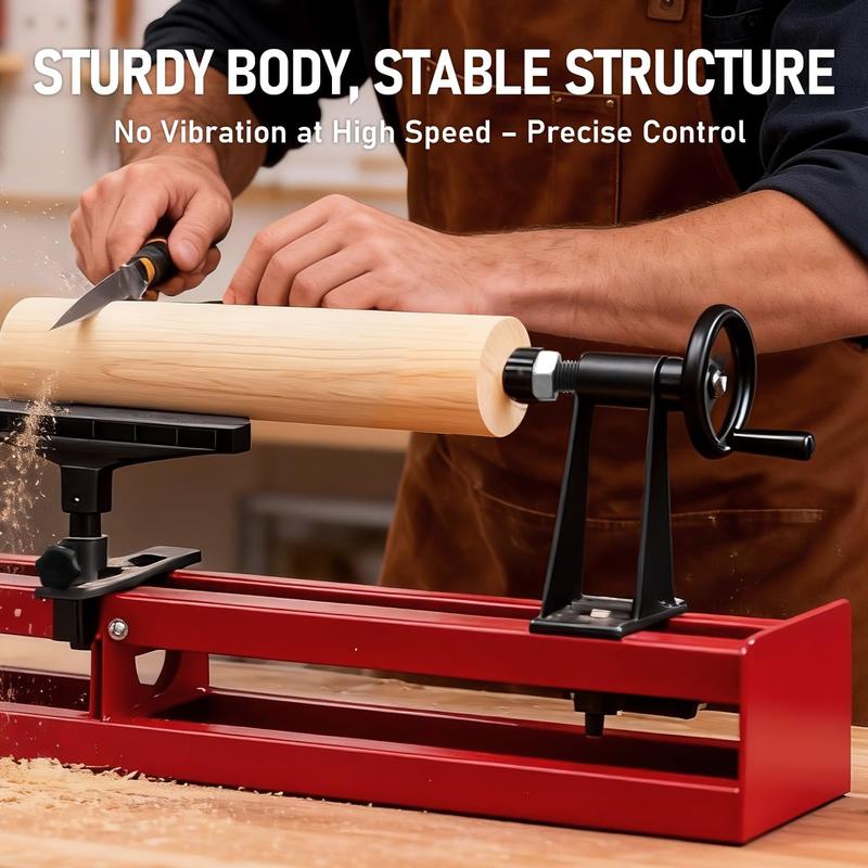 · Minimal Vibration & Enhanced Stability – Built with a reinforced aluminum alloy base and precision-ground bedways, this wood lathe reduces vibration for cleaner cuts and a safer work experience.