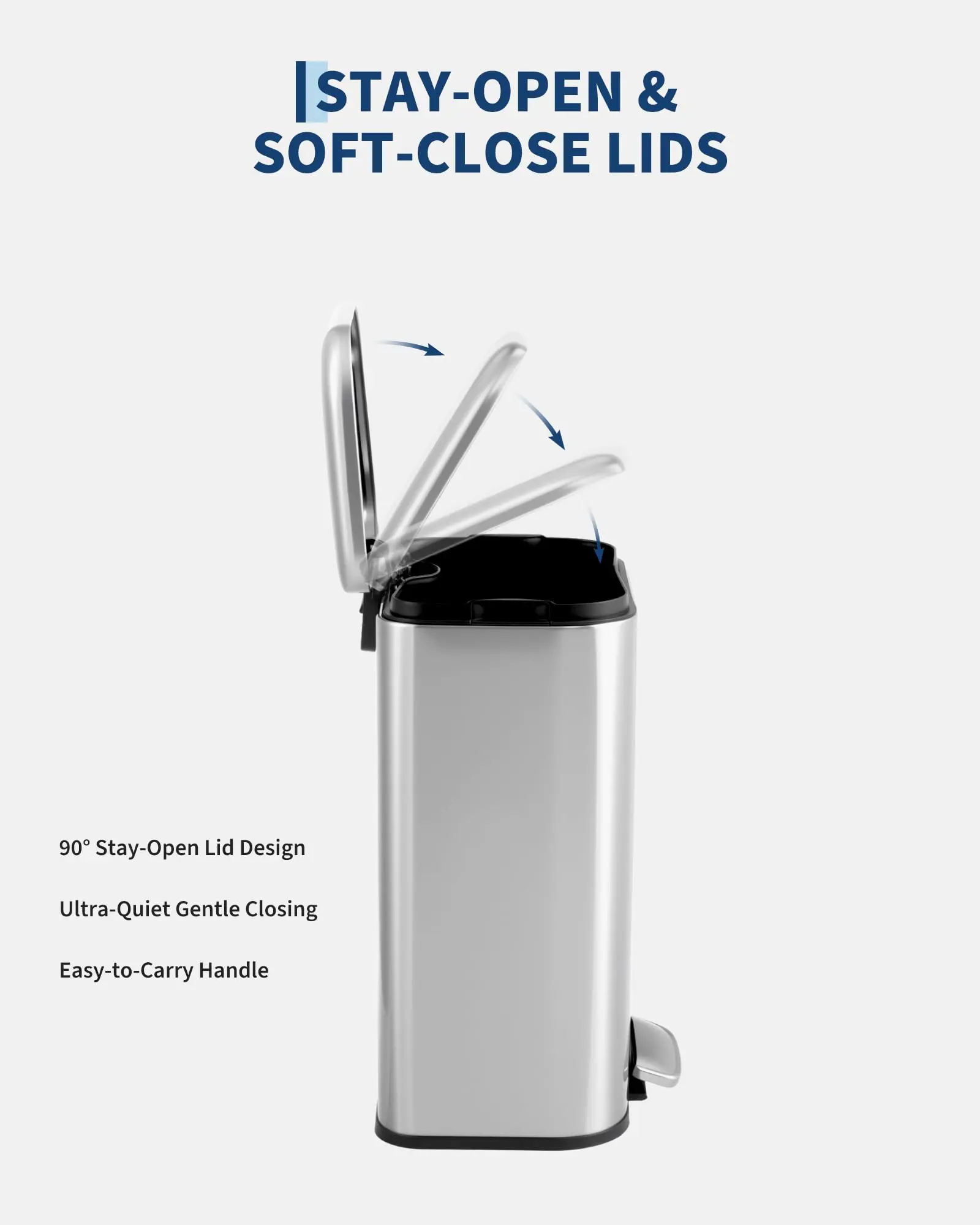 · Hands-Free Convenience, Stay-Open Feature: The sturdy step pedal offers hands-free operation for ultimate hygiene, while the 90° stay-open lid design allows for easy trash disposal during meal prep or cleaning—making this step trash can both efficient and easy to use