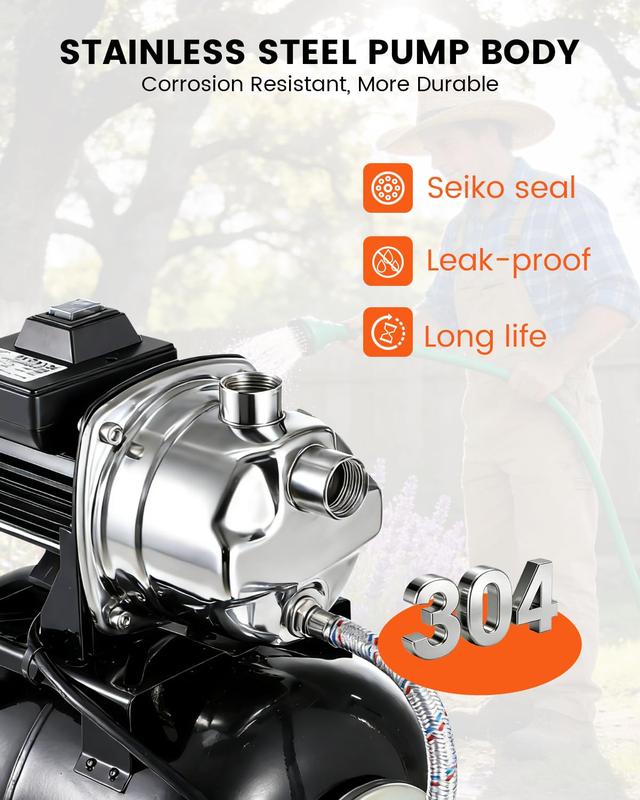 · Corrosion Resistant Durability: Crafted with a 304 stainless steel pump body, this shallow well water pump resists rust and corrosion for lasting reliability. Rest assured your jet pump is built to withstand the elements and deliver trouble-free operation year after year