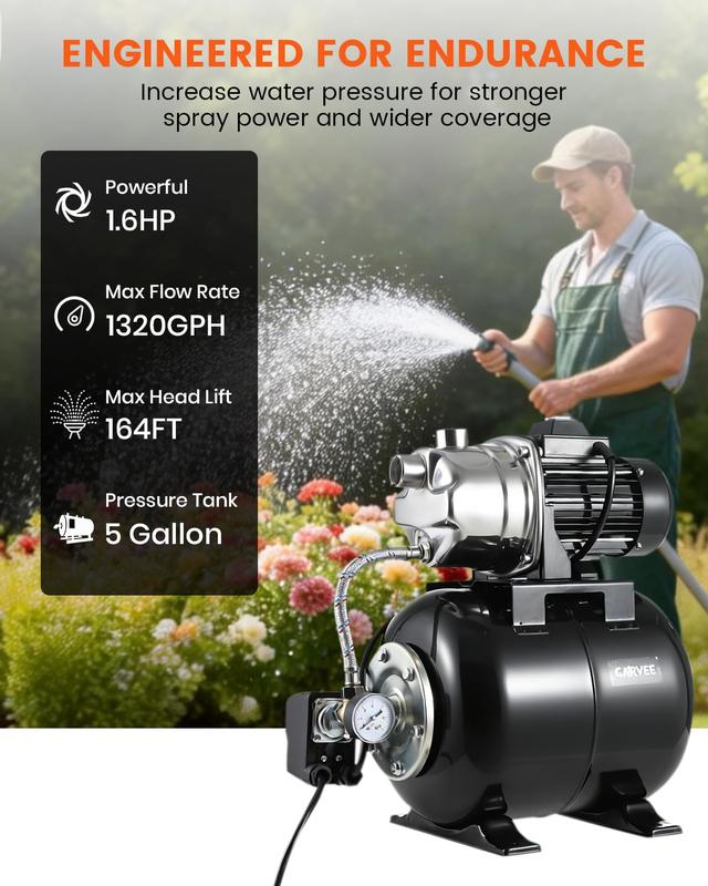 · High Power & Large Flow: This shallow well pump with pressure tank features a powerful 1.6 HP motor, delivering up to 1320 GPH and a head lift of 164 ft. Easily meets the demands of home water systems, irrigation, and garden watering with consistent, high-volume output