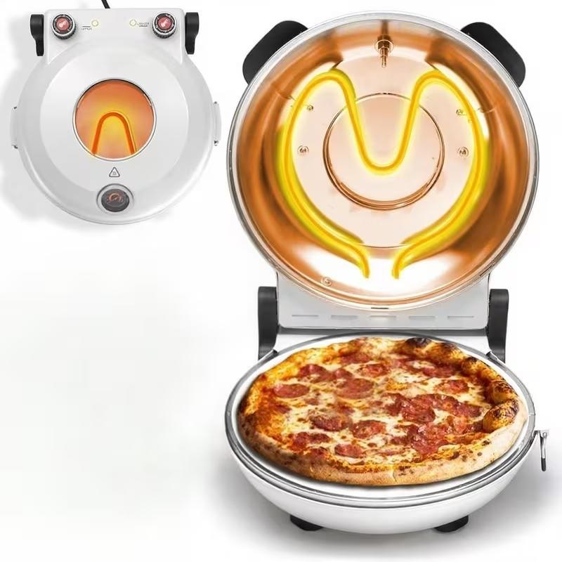 CONVENIENT AND SAFE - Featuring cool-touch handles and a large viewing window, this pizza maker is designed for convenience and safety. The built-in thermometer and double-thermometer controls allow precise adjustments for perfect results every time.