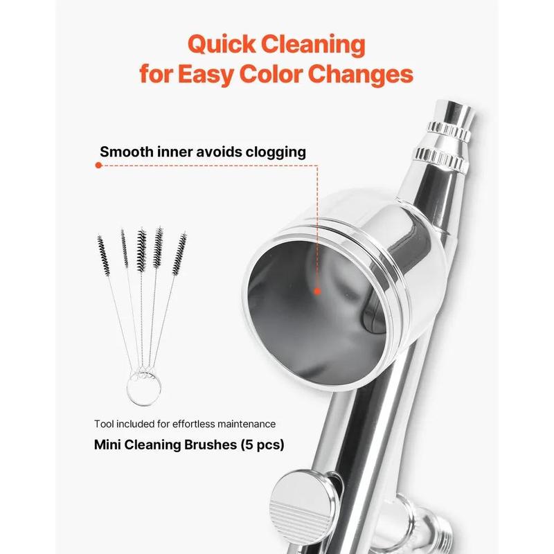 This air brush kit includes a full cleaning kit and a smooth inner chamber to avoid clogging. Switch colors in seconds and maintain peak performance with minimal effort. It ensures hassle-free maintenance and quick color changes.