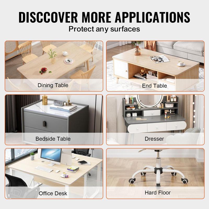 • Versatile Applications: Our clear table cover protector can enhance a variety of environments, including homes, offices, restaurants, and event venues. They are suitable for wooden textured desktops such as dining tables, kitchen countertops, end tables, computer tables, dressers, TV cabinets, and more. Unlock limitless possibilities and enhance your experience!