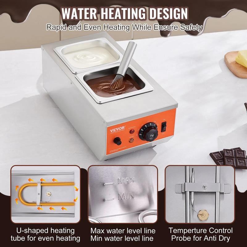 ·2 Large Capacity Cylinders: This stainless steel chocolate melter pot includes 2 independent cylinders. You can use one for melting chocolate and the other for melting milk or cream, which helps to improve efficiency in both work and daily life. Each pot has a capacity of 1.7 qt, serving a large number of people simultaneously.