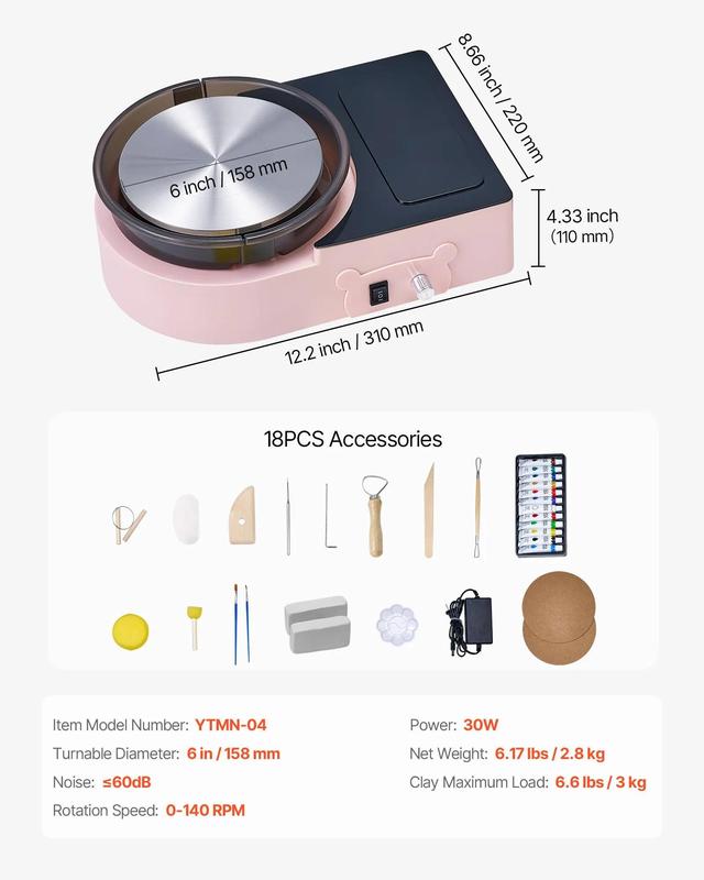 ·Powerful Motor: This mini pottery wheel boasts a 30W motor and a 6-inch aluminum alloy turntable. It supports up to 6.6 lbs of clay, making it ideal for both kids and adults. 🌟