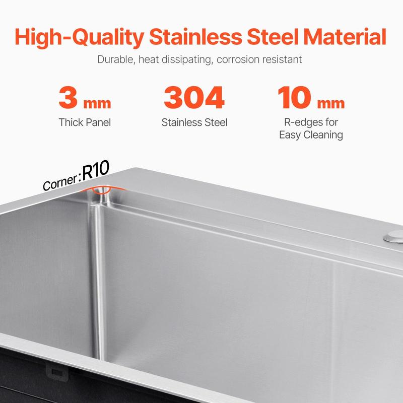 ·Heavy-Duty Stainless Steel: This kitchen sink workstation is made from high-quality 304 stainless steel, ensuring durability, rust resistance, and easy cleaning. However, avoid sharp objects to prevent surface scratches. The upgraded panel thickness is 3 mm, 50% thicker than most standard kitchen sinks. It features R10° rounded corners for easy cleaning and a modern aesthetic.