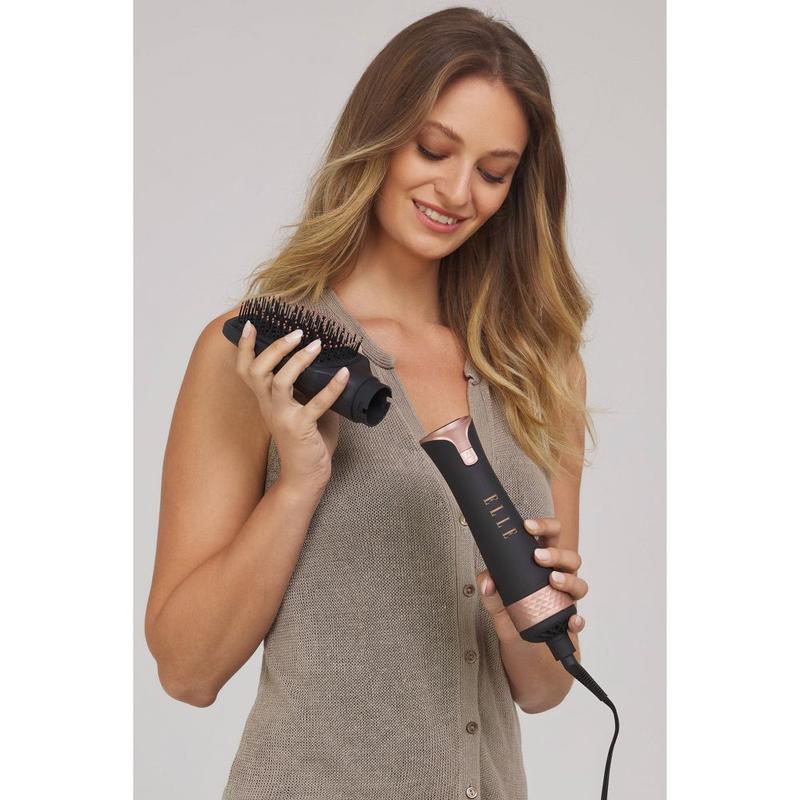 The Elle Premiere Hair Dryer Brush and Volumizer delivers beautiful volume and shine in one simple step. The 360 degree design combines the power and heat of a blower with the shape of a brush. It comes with four interchangeable heads including a concentrator, round barrel brush, oval brush, and paddle brush. Ionic technology helps leave your hair looking conditioned and smooth while reducing frizz and static. Each brush head features a ceramic coating, which helps protect your hair from heat damage by distributing heat evenly while providing beautiful results. The lightweight design and 360 degree swivel cord provide an easy, tangle-free experience.