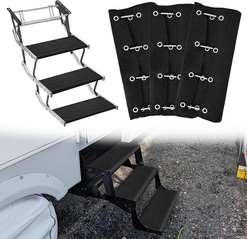 ·EASY CLEANING & PACKAGE CONTENTS – Remove the rv step cover for easy cleaning by rinsing or soaking, which dries quickly and resists fading. Package includes 3x black camper stair covers and 12x stainless steel fixing springs