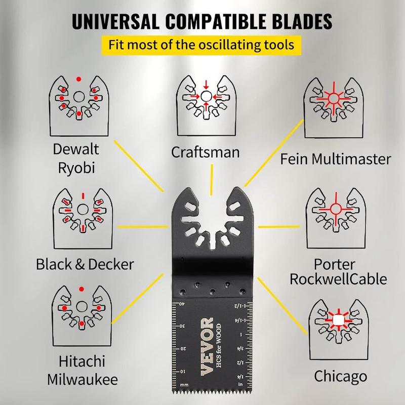 VEVOR 50 PCS Oscillating Saw Blades, Universal Quick Release Oscillating Saw Blades, Multitool Tool Blades for Wood Plastic Metal Nails, Compatible with Milwaukee Dewalt Dremel Fein Worx Bosch MakitaSpecificationsModel: 1004KMaterial: HCSSuitable for: Wood PlasticBlade Type: 1-3/8" standard Saw BladesSize: 1-3/8"Hardness: 45-47 HRCPackage Content100 x Oscillating Saw BladesVEVOR 50 PCS Oscillating Saw Blades, Universal Quick Release Oscillating Saw Blades, Multitool Tool Blades for Wood Plastic