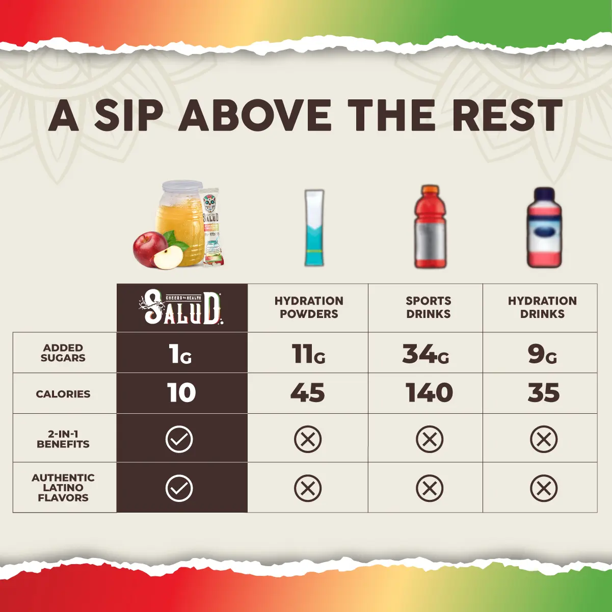 ·US vs THEM - Unlike other sports drinks and hydration multipliers that are loaded with sugars and artificial dyes, Salud will turn plain water into a mouth-watering Agua Fresca drink with only 1g of added sugar and 10 calories per serving. So delicious you might forget each serving is packed full of powerful benefits!