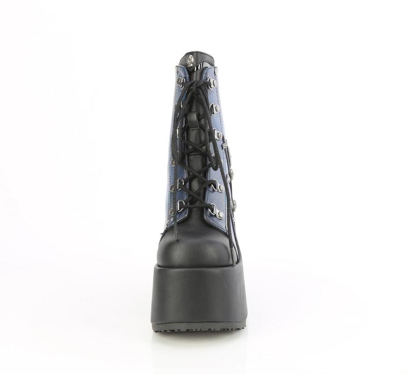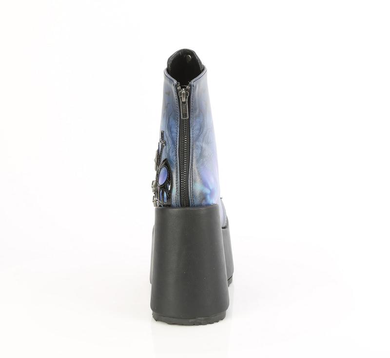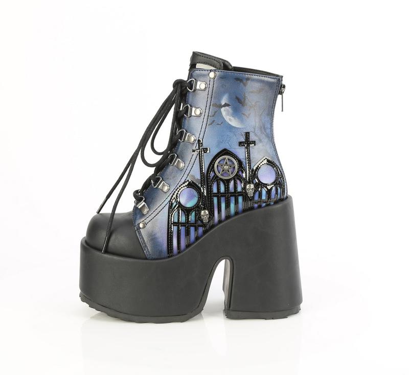 5" (127mm) Chunky Heel, 3" (75mm) Platform D-Ring Lace-Up Dront Ankle Boot Featuring Moonlit Cathedrial Printed Artwork & Charm Detail, Metal Back Zip Closure