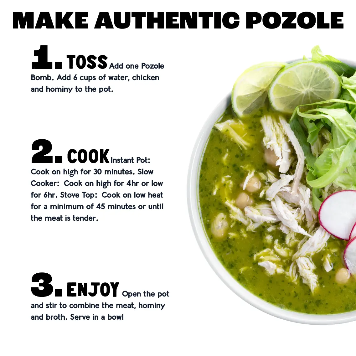 Mix 1 Pozole Verde Bomb with 4 lbs meat, 6 cups water, and 25 oz hominy.