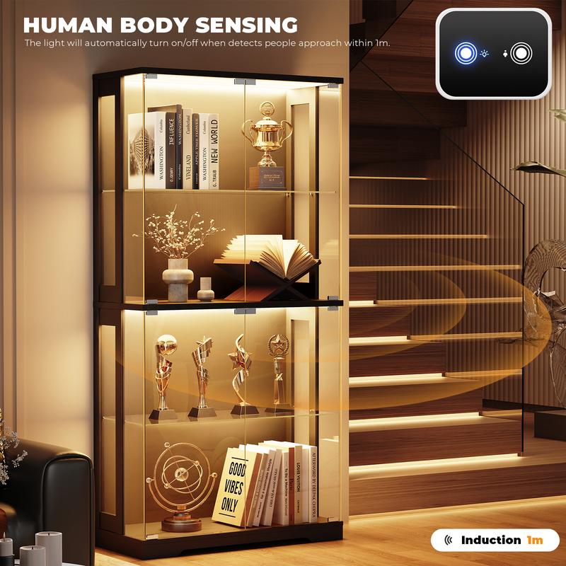 【Smart Human Sensor】This curio cabinet includes is equipped with smart human body sensing that automatically turns on/off when you approach or leave within 1 meter. Which make your life more convenient and intelligent. Showcasing your favor trophy at night.
