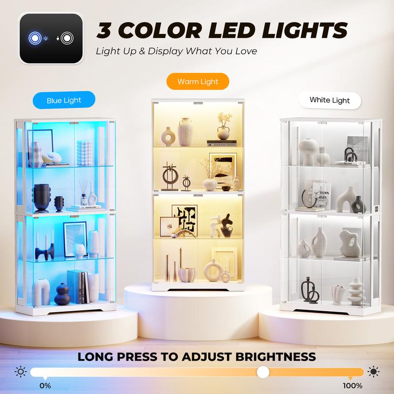 【3 Color LED Lighting】Equipped with adjustable LED lights offering blue, warm and white lights for customizable ambiance and clear display your favorite items at any time, brightness adjustable.