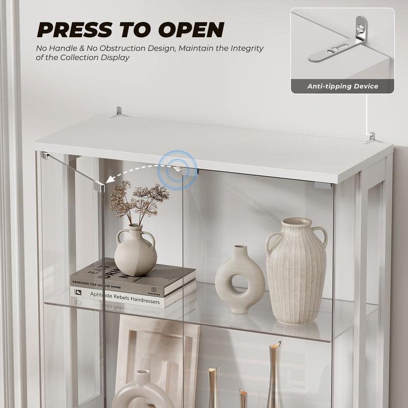 【Pop-Up Glass Door】This display cabinet features tempered glass door that offers a clear view for your collection, the handle-free design make it easier to open and adds sleek sophistication. The high-definition glass surface keeps the display case no distortion and standout for any room.