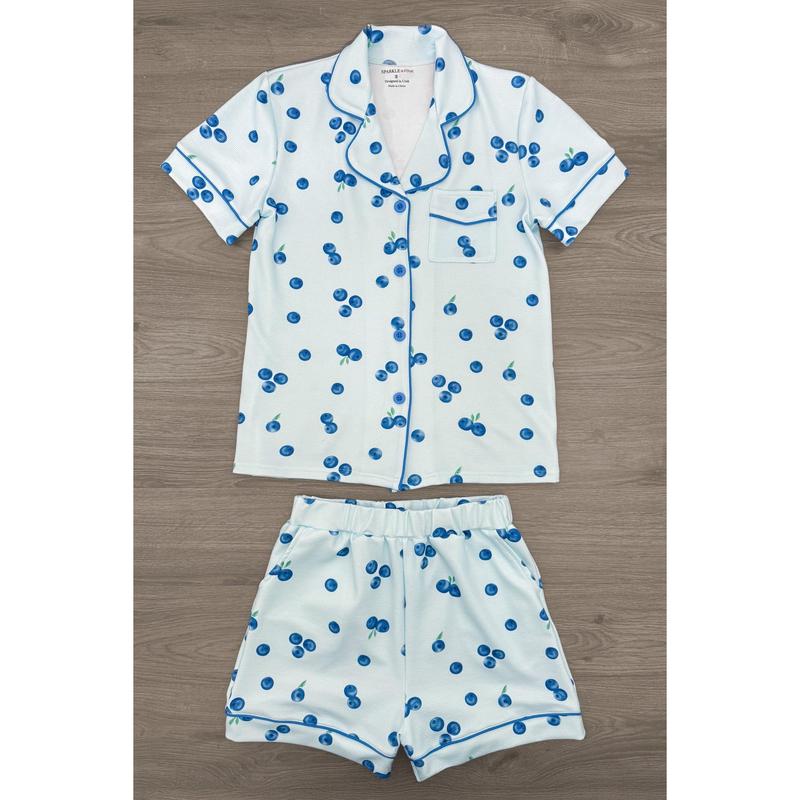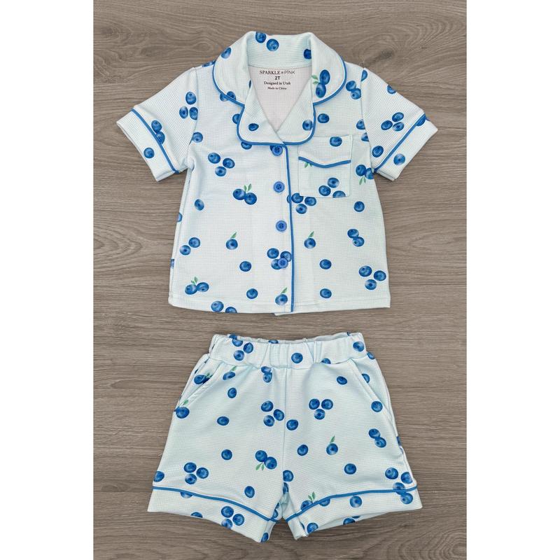 Cozy up with our Blueberry Waffle Knit Pajamas. The blue short sleeve top features an allover blueberry print and looks adorable paired with the matching shorts. The baby onesie features a front zip-up design with a matching print. The top and shorts can be worn as a set and paired with our matching bows or keep it laid back with a pair of slippers. This set is perfect for snuggling by the fireplace with your little ones!