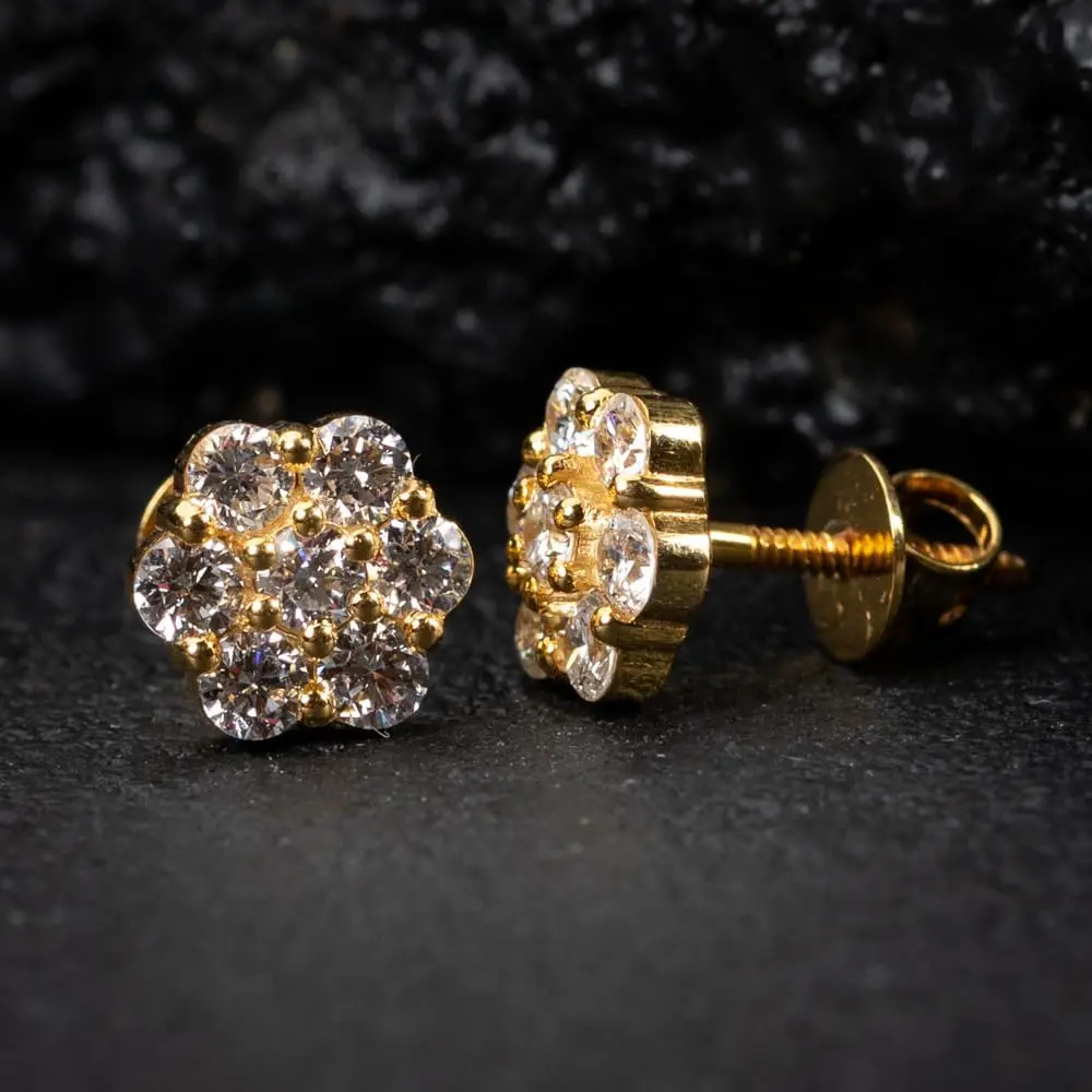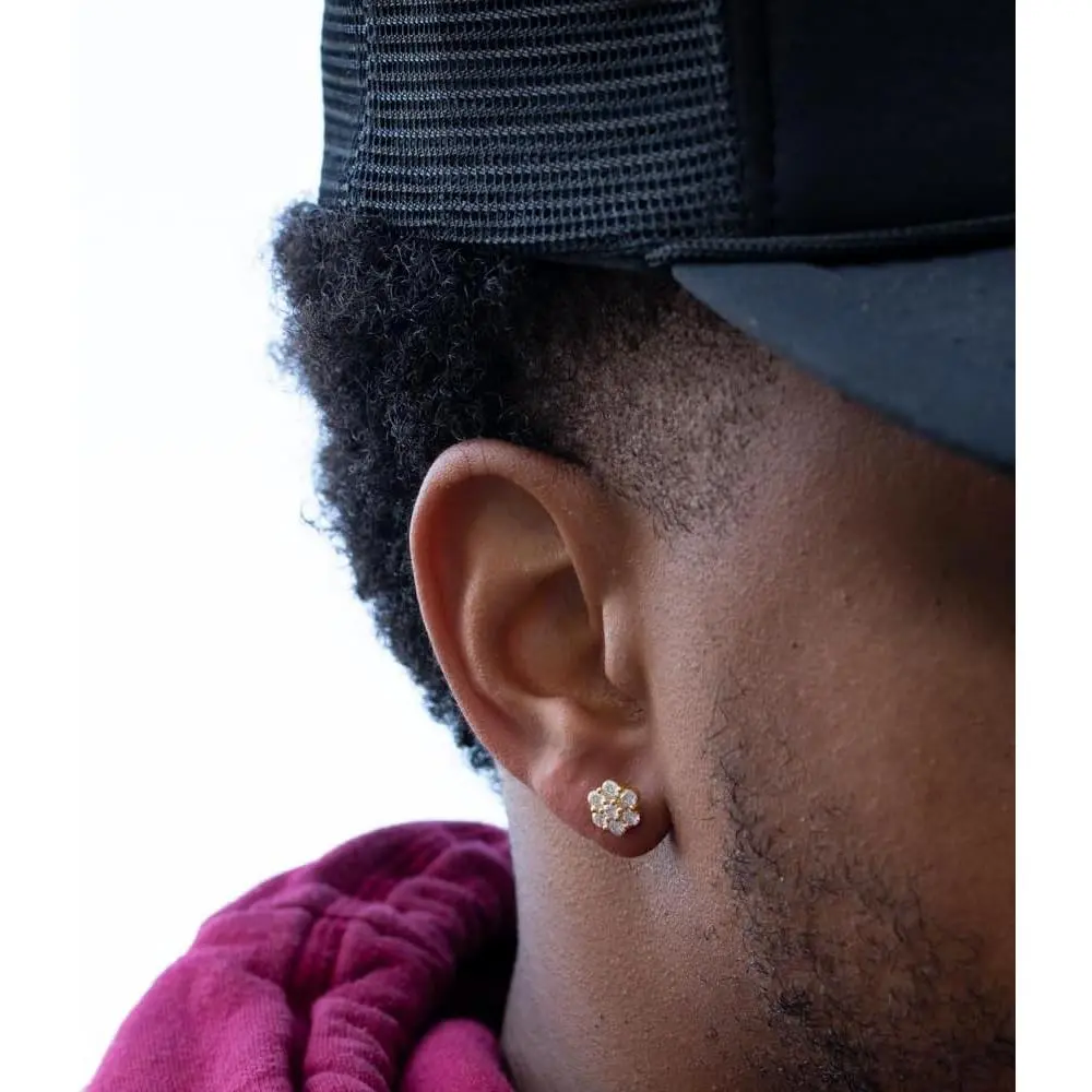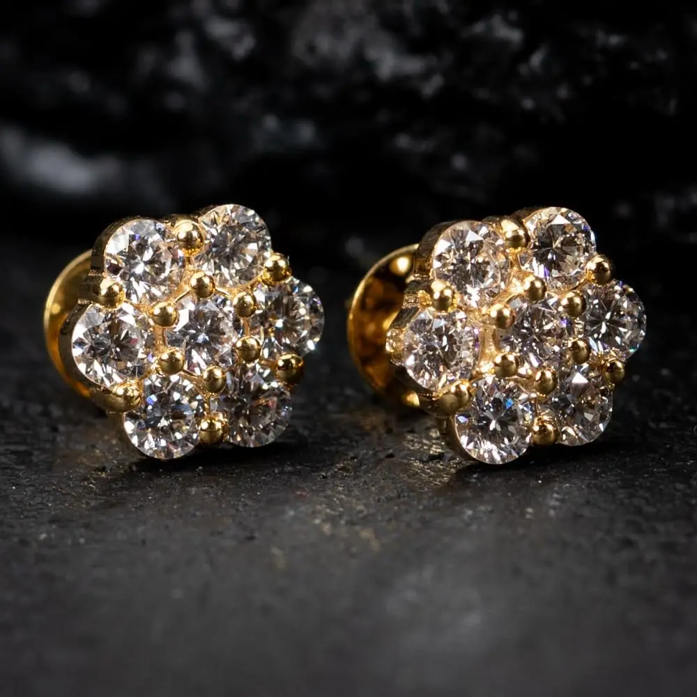 14K Gold Plated Flower Cluster Stud Earrings – Unisex Hip Hop Round Earrings, Iced-Out Style, Screw Back men's valentine's gifts