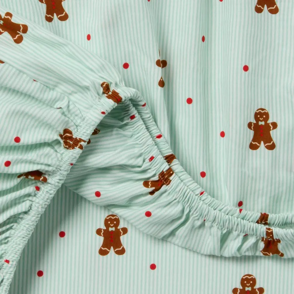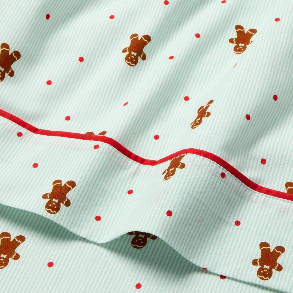 Deck out your kid’s room for the holidays with this Gingerbread Dreams Kids' Cotton Sheet Set from Pillowfort. This printed sheet set includes one fitted sheet that fits mattresses up to 16 inches deep, one flat sheet and one pillowcase, each made from 100% cotton fabric for a soft feel and crisp finish. Showcasing allover gingerbread man cookie graphics on an light green-hued striped background, these bedding pieces bring seasonal flair to their room. Best of all, you can toss them in the washing machine for a quick refresh whenever needed.