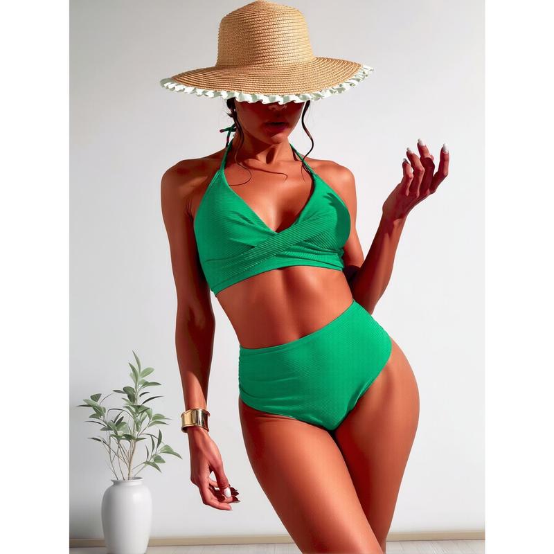 BlushHub Bright Green Halter Twist Two-Piece Swimsuit | Sexy Hot Girl Style, Halter Design, Front Twist & High Waist Tummy Control
