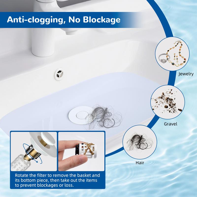 ·[Upgraded 3 in 1 Design] The Hibbent bathroom sink drain strainer boasts an innovative 3-in-1 design that seamlessly integrates water storage, rapid drainage, and effective filtering functions. In water storage mode, it caters to your soaking or washing needs, while the drainage mode efficiently empties the sink. The built-in basket captures small items like hair, jewelry, and debris, preventing them from clogging the drain and allowing you to recover valuable items like earrings and necklaces. This multifunctionality greatly enhances your daily convenience. Note: This stopper is NOT suitable for bathtub drains and can not fit drain with lever!