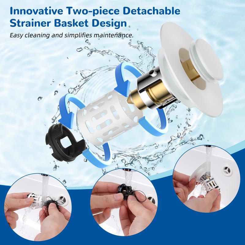 ·[Easy to Clean] Cleaning is just as easy. The dual-layer removable basket can be easily removed by simply twisting, allowing you to thoroughly clean all components of the drain stopper. Additionally, the basket's detachable bottom design surpasses similar non-removable options, making cleaning more comprehensive and preventing the awkwardness and inconvenience of digging out items by hand