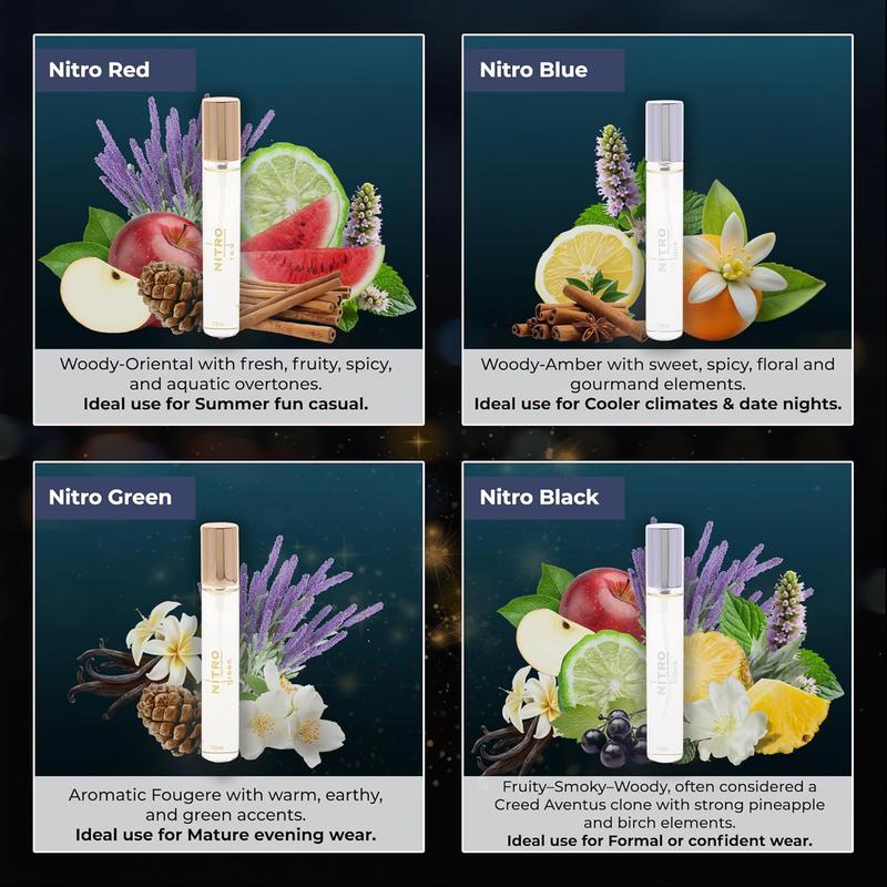 3. Nitro Green A bright citrus‑aromatic blend with grapefruit, lemon, and cedarwood, offering an energizing, modern masculine freshness.