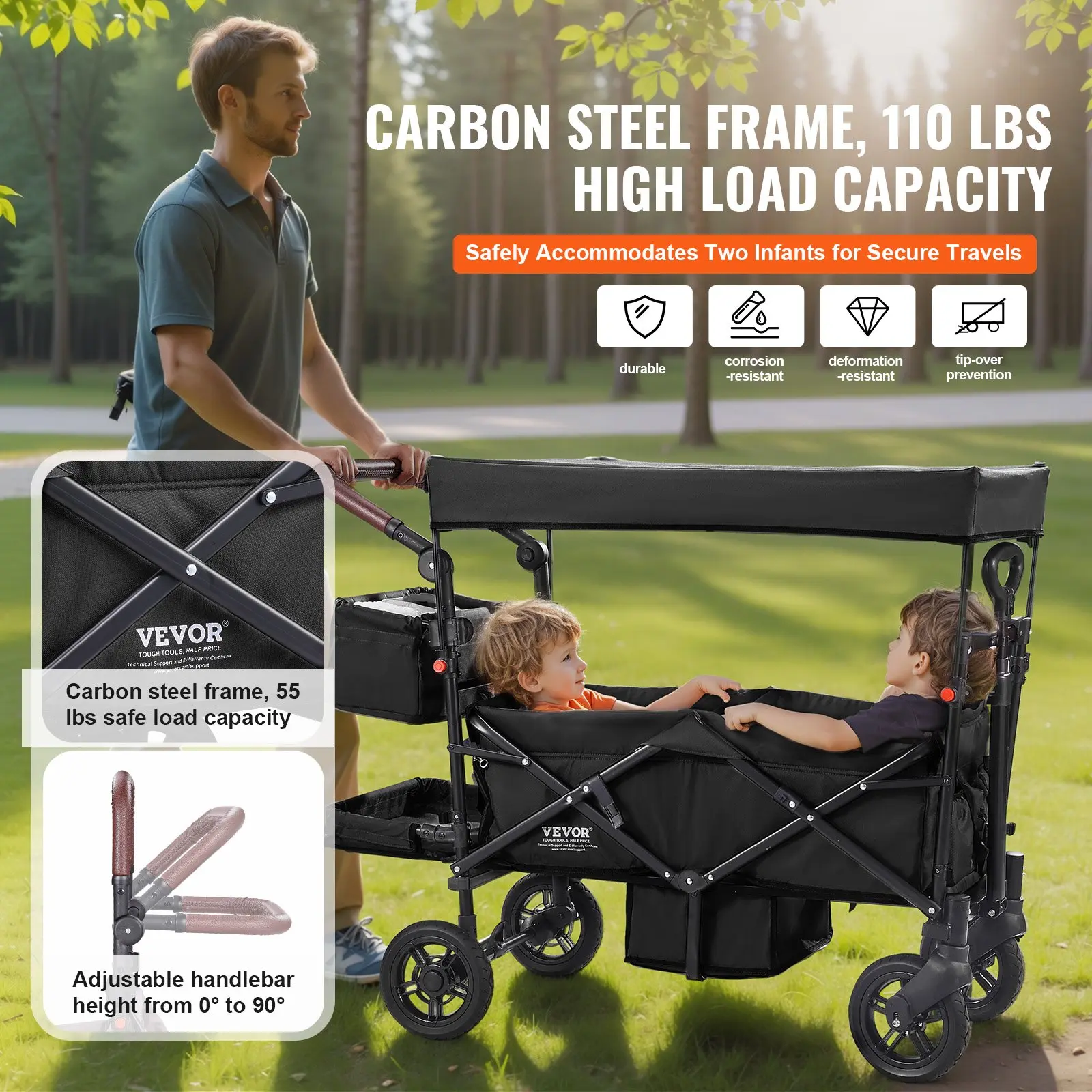 Effortless Folding: Traveling with kids is no longer a challenge!Our double stroller features a one-click folding mechanism that allows for quick and easy folding in just a few steps.Whether you're shopping or traveling, you can handle the busy moments with ease.55 lbs High Load Capacity: Designed for twin families, it boasts a sturdy carbon steel frame that can support up to 55 lbs, ensuring your babies travel safely.The adjustable handle height accommodates different needs, making the stroller more flexible and convenient.Durable and Shock-Absorbing: Equipped with wear-resistant shock-absorbing wheels, it handles any terrain bumps smoothly.The front and rear wheel shock absorption design greatly reduces vibrations from the road, providing a more comfortable ride for your baby.Multi-Functional: Featuring a detachable canopy to provide sunshade or rain protection, keeping your baby comfortable inside the stroller.Additionally, the stroller comes with a large capacity storage bag, achieving a multifunctional design for shading and storage.Easy Disassembly: Simple and easy installation, no more cumbersome assembly process. Just follow the manual steps to assemble the parts in order. Disassembly and folding are also space-saving, making storage convenient.VEVOR Wagon Stroller for 2 Kids, Push Pull Quad Collapsible Stroller with Adjustable Handle, Encircling Harness Removable Canopy, 4 Wheels with Brakes, Mutifunction Tandem Stroller for Camping Black