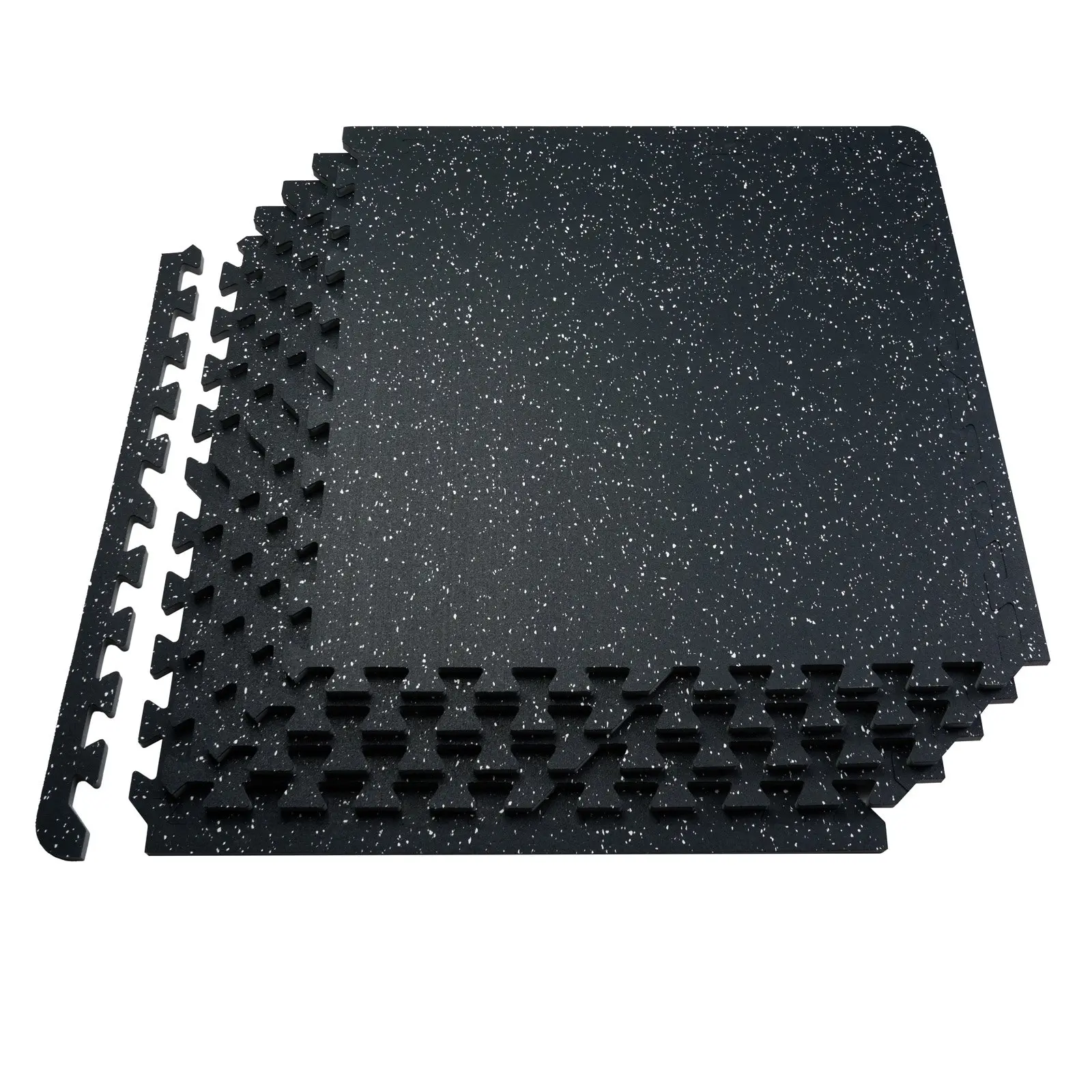 Thickness: 0. 56 in,Area: 24 SQFT,Set Quantity: 6 pcs,Color: Black with White Dots,Item Model Number: HRD-XJD6614-6W,Product Weight: 6. 6 kg / 14. 55 lbs,Dimensions: 24 x 24 in (per piece), with 2 Toothed Edges + 2 Straight Edges,Product Dimensions: 24 x 24 x 0. 56 in / 610 x 610 x 14 mm,Main Material: Top Layer: Rubber, 2 mm (Synthetic Rubber + 5% EPDM Granules), Bottom Layer: PE, 12 mm