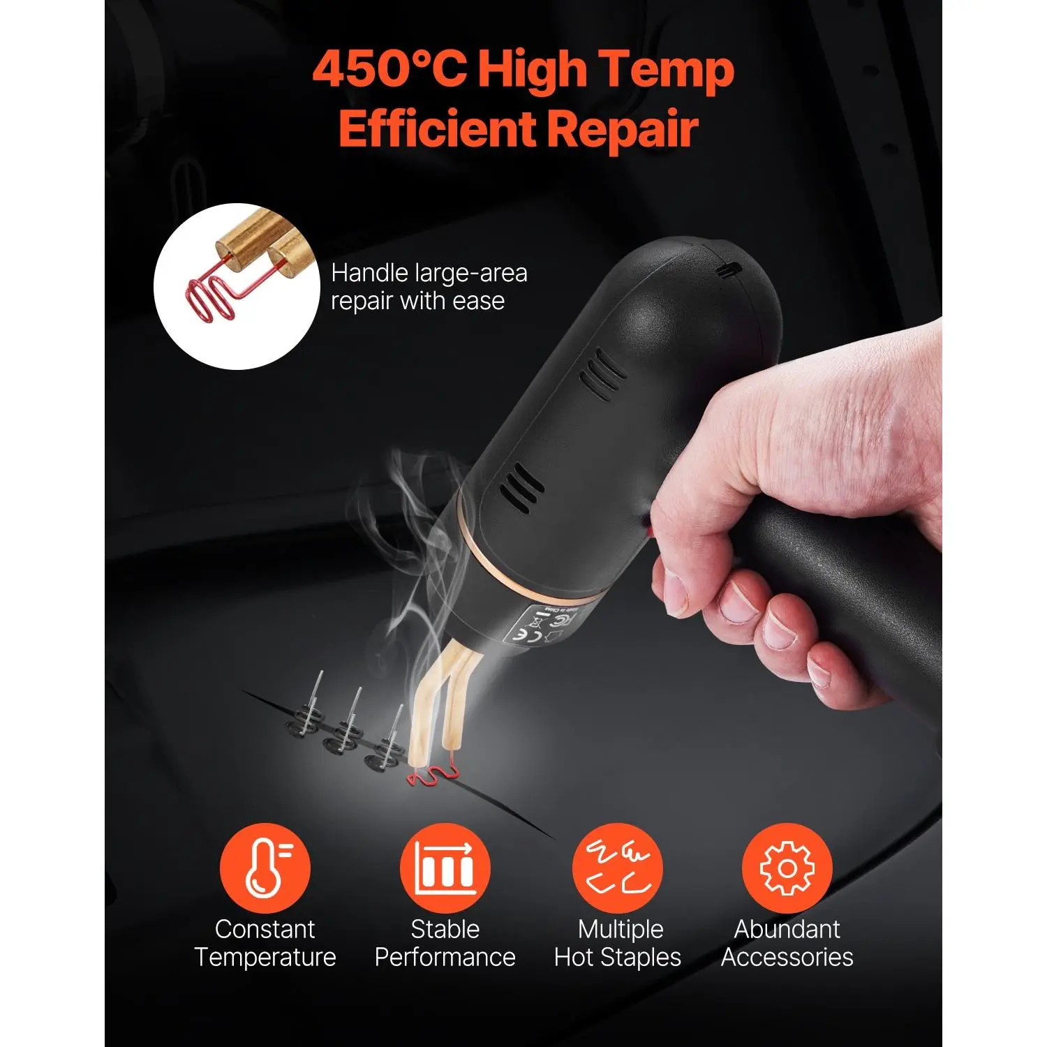 No Cord, No Limits: Equipped with a 5000mAh high-capacity lithium battery and USB rechargeable design, this cordless plastic welder offers up to 120 minutes of runtime, giving you the freedom to weld without being limited by a power cord.Rapid Heating: With a powerful 120W output, this wireless hot staple plastic welder gun heats up to 450℃ in just 1 to 3 seconds.Featuring built-in overcharge/overdischarge protection, this plastic repair kit ensures efficiency, safety and stability while extending the tool's lifespan.Professional Welding Kit: The wireless welding tool kit includes 400 welding staples, 1 diagonal pliers, 1 art knife, 1 charging cable, and 1 USB cable.These professional welding accessories of this cordless plastic welder enhance repair convenience, making the process more efficient for all users.Wide Applications: This battery-powered plastic welder offers 400PCS 4 types of hot staples for various plastic repair needs.With large and small wave staples, V-shaped, and M-shaped staples, it's ideal for repairing car bumpers, dashboards, lamp bases, plastic rings, motorcycles, and daily plastic items.Easy Operation: Our plastic welding gun is lightweight and user-friendly, with an ergonomic handle design that reduce hand fatigue and boosts work efficiency.Its compact body ensures greater flexibility during welding tasks, making it ideal for various work environments.VEVOR Cordless Plastic Welder, 120W Plastic Welding Gun with 400PCS 4 Types Hot Staples, Rechargeable Hot Staple Welding Gun, Plastic Car Bumper Repair Kit for Kayak, Toys, Plastic Crack Repair