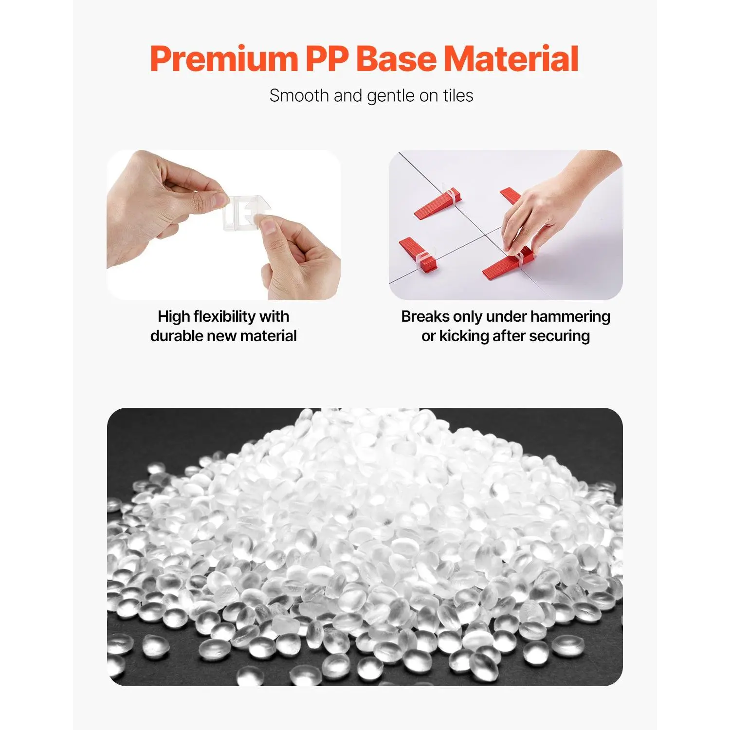 Tile Leveling System: Our tile spacers quickly level tiles, making them an essential tool for tile installation.Suitable for both wall and floor tiles, they ensure tiles stay level and in place, improving surface flatness.High-Quality PP Material: Our tile leveling system features a high-quality PP base, offering strong toughness, smooth edges without burrs, and ensuring no damage to tiles.It is durable and breakage-resistant during use.1/16 Inch Universal Size: Our tile leveling system ensures even gaps.The 1/16 inch tile clips are ideal for small square and rectangular tiles, commonly used on walls and floors in kitchens and bathrooms.Bonus 200pcs Included: Our set includes 2000 pieces of 1/16 inch tile leveler spacers, with an additional 200 spacers of the same size.This ensures efficient and precise installation for large projects, enhancing both construction efficiency and user experience.Note: Wedges Not IncludedEfficient Operation: Our tile spacers leveling system is easy to install with no complex tools required, allowing for fast and efficient tile laying.VEVOR Tile Leveling System Clips, 2200-Piece DIY Tile Leveler Spacers, 1/16"(1.5 mm) Tile Leveler Clips, Tile Leveling System Tile Installation Tools for Professional Ceramic Tile, Stone Installation