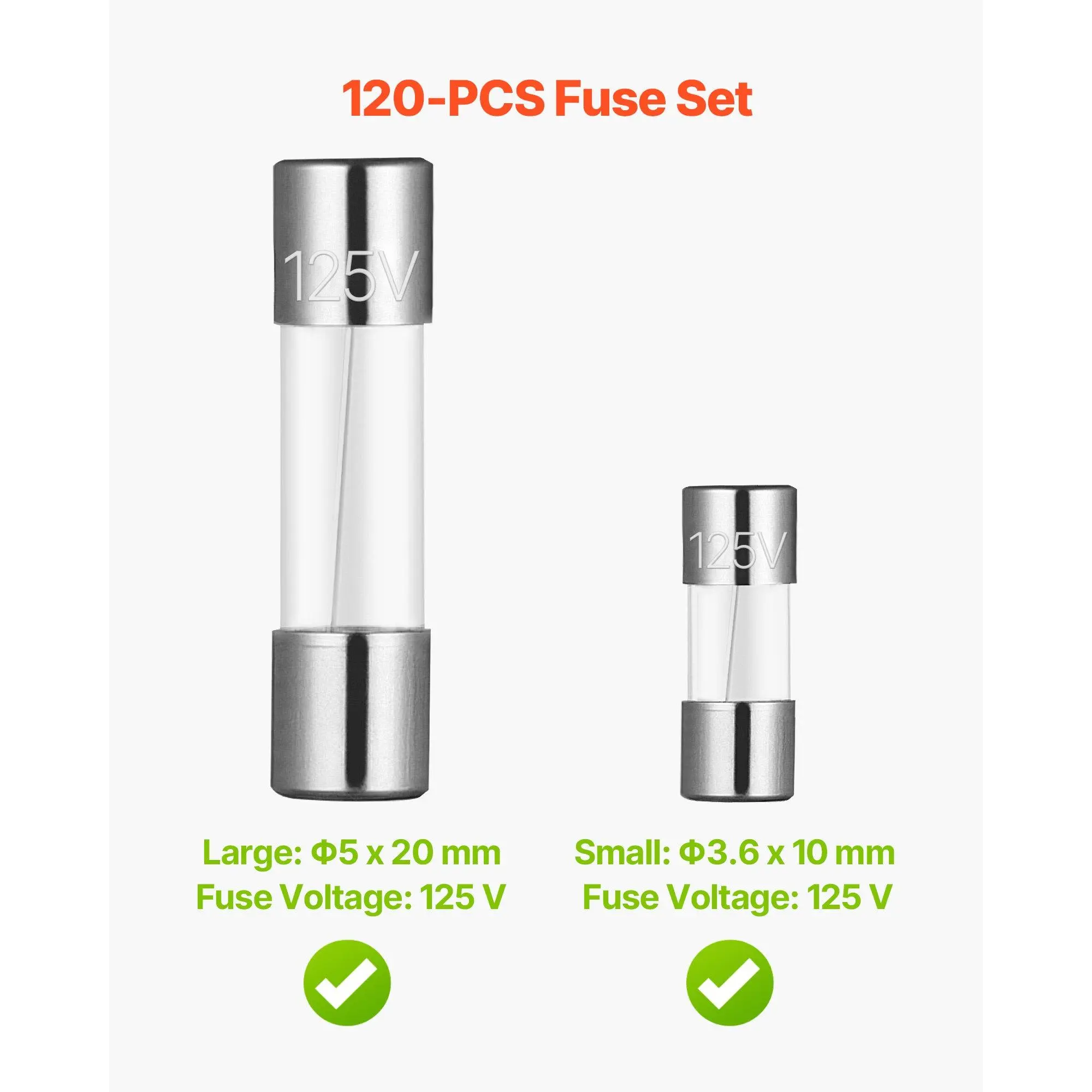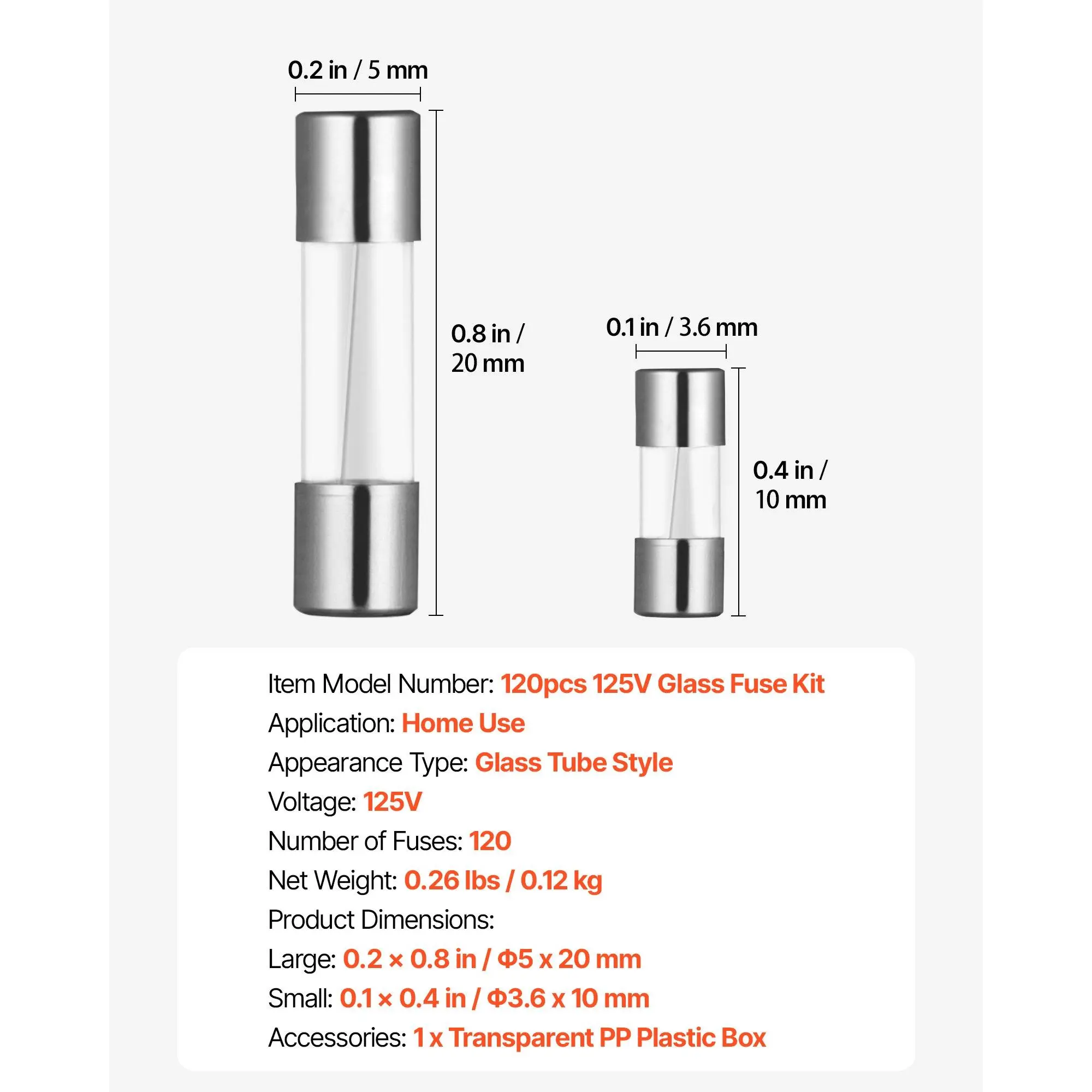 Small: 0.1 x 0.4 in / Φ3.6 x 10 mm,Appearance Type: Glass Tube Style,Voltage: 125V,Large: 0.2 x 0.8 in / Φ5 x 20 mm,Item Model Number: 120pcs 125V Glass Fuse Kit,Number of Fuses: 120,Product Dimensions:,Application: Home Use,Net Weight: 0.2 lbs / 0.109 kg