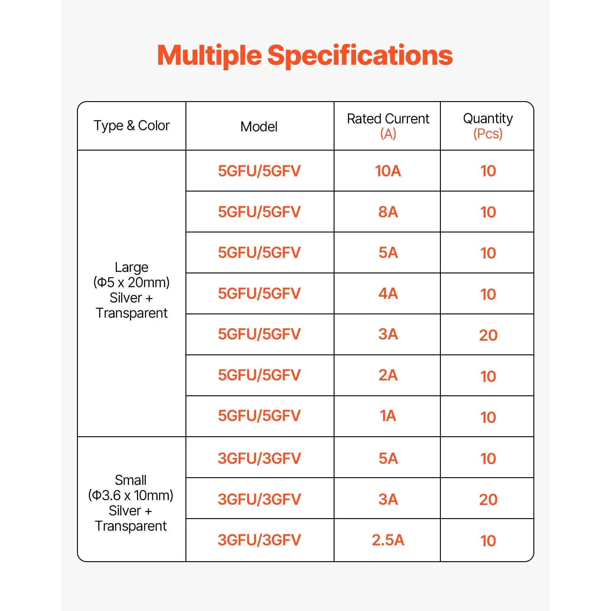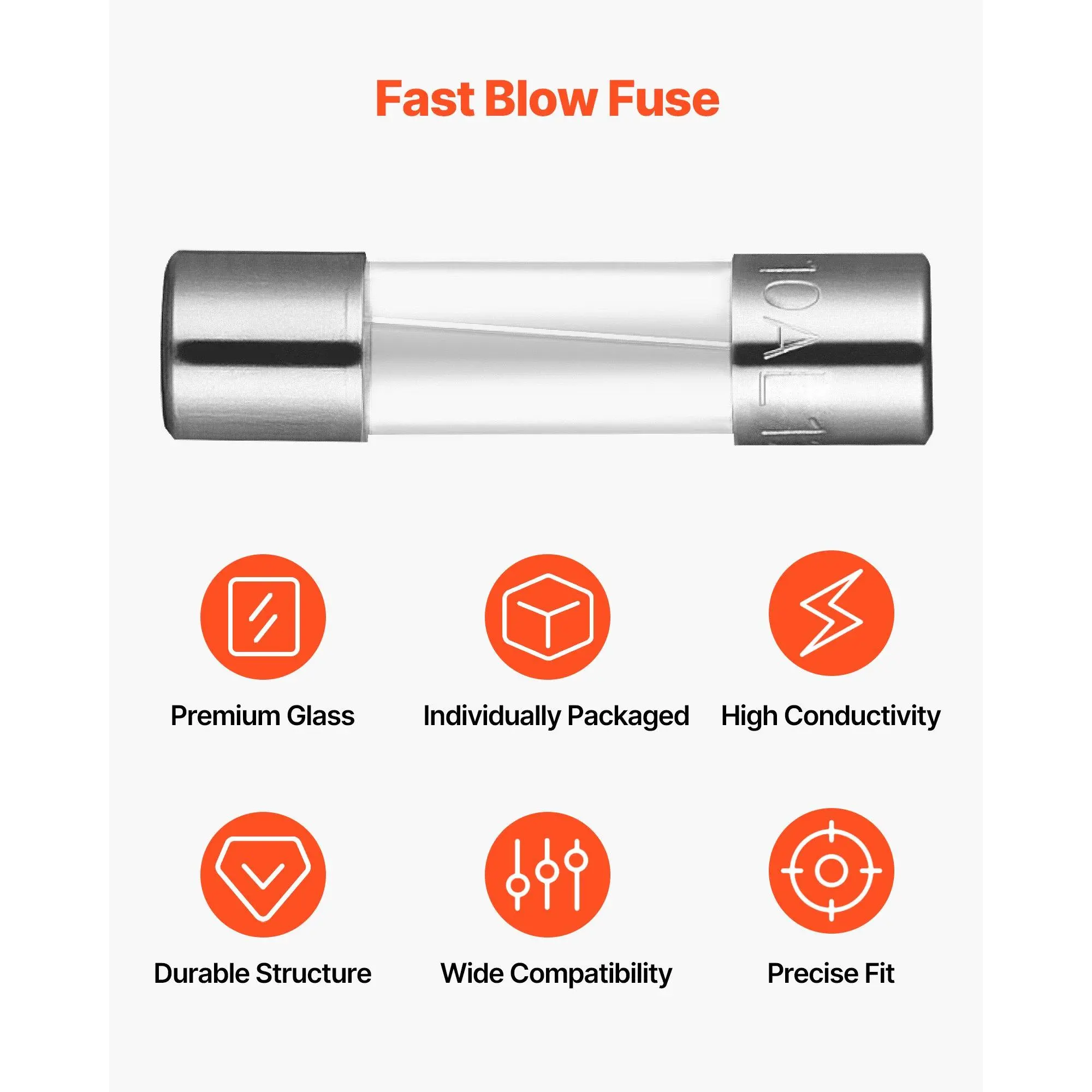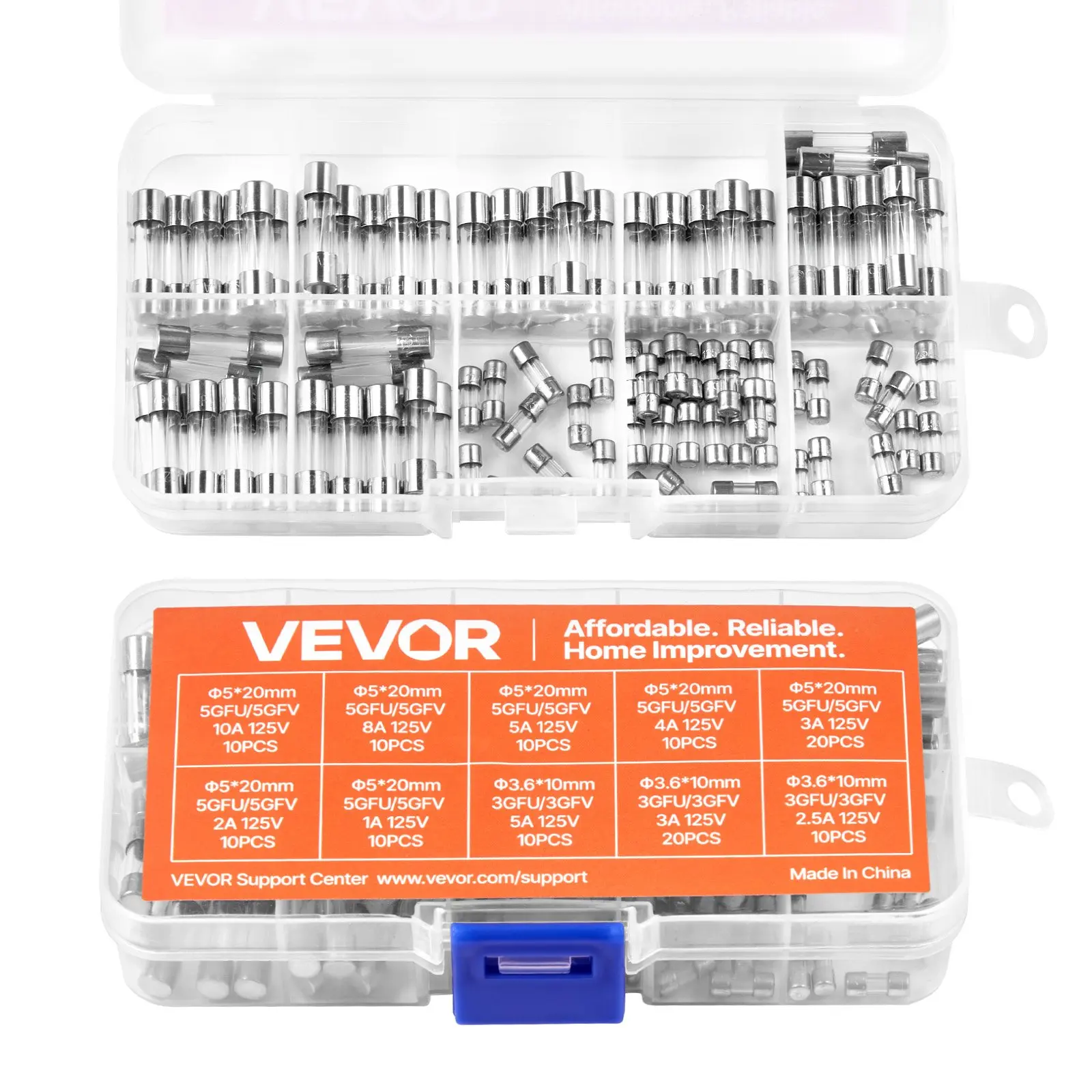 120-piece Fuse Set: This glass fuse kit includes 120 fuses, ideal for quick replacements in holiday lights, mini LEDs, and small electronics.It’s a budget-friendly solution for your everyday fuse replacement needsPremium Materials: Crafted from durable glass, these tube fuses are built to last and ensure secure use.With a long lifespan, the quick-blow feature secures your devices from overheating or short circuits, preventing damageConvenient Storage: Keep things organized with the included storage box!The divided compartments and transparent design let you easily find the right fuse, no more digging through cluttered drawersMultiple Sizes: Our glass fuses assortment kit includes large fuses (Φ0.2 x 0.8 in / Φ5 x 20 mm - 125V) in 6 types (1A, 2A, 3A, 5A, 8A, 10A) and small fuses (Φ0.1 x 0.4 in / Φ3.6 x 10 mm - 125V) in 5 types (2.5A, 3A, 5A), covering all your needsExcellent Compatibility: Designed for manufacturers, appliance makers, equipment repair technicians, and DIYers.These fast-blow glass fuses are ideal for circuit overload protection, keeping your devices safe across various applicationsVEVOR Fast-Blow Glass Fuses Assortment Kit, 120 Pcs 125 Volt, 5 x 20 mm 1A 2A 3A 4A 5A 8A 10A, 3.6 x 10 mm 2.5A 3A 5A Tube Fuses, Suitable for Electrical Boxes, LED Strips, Electronics, Appliances