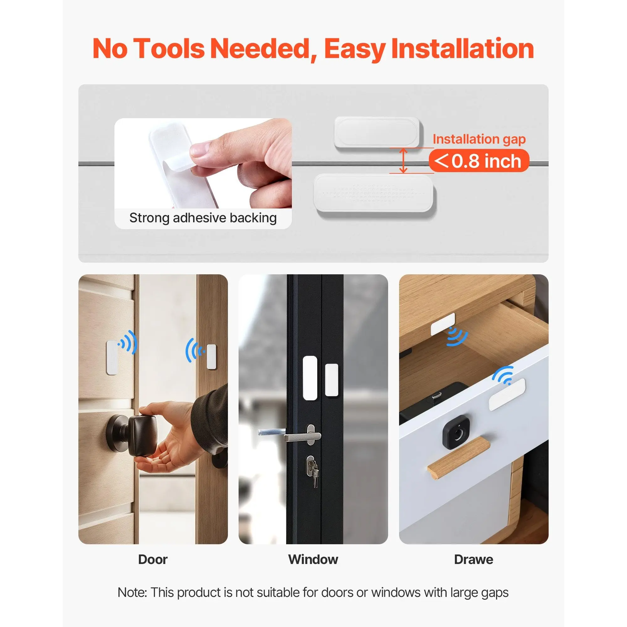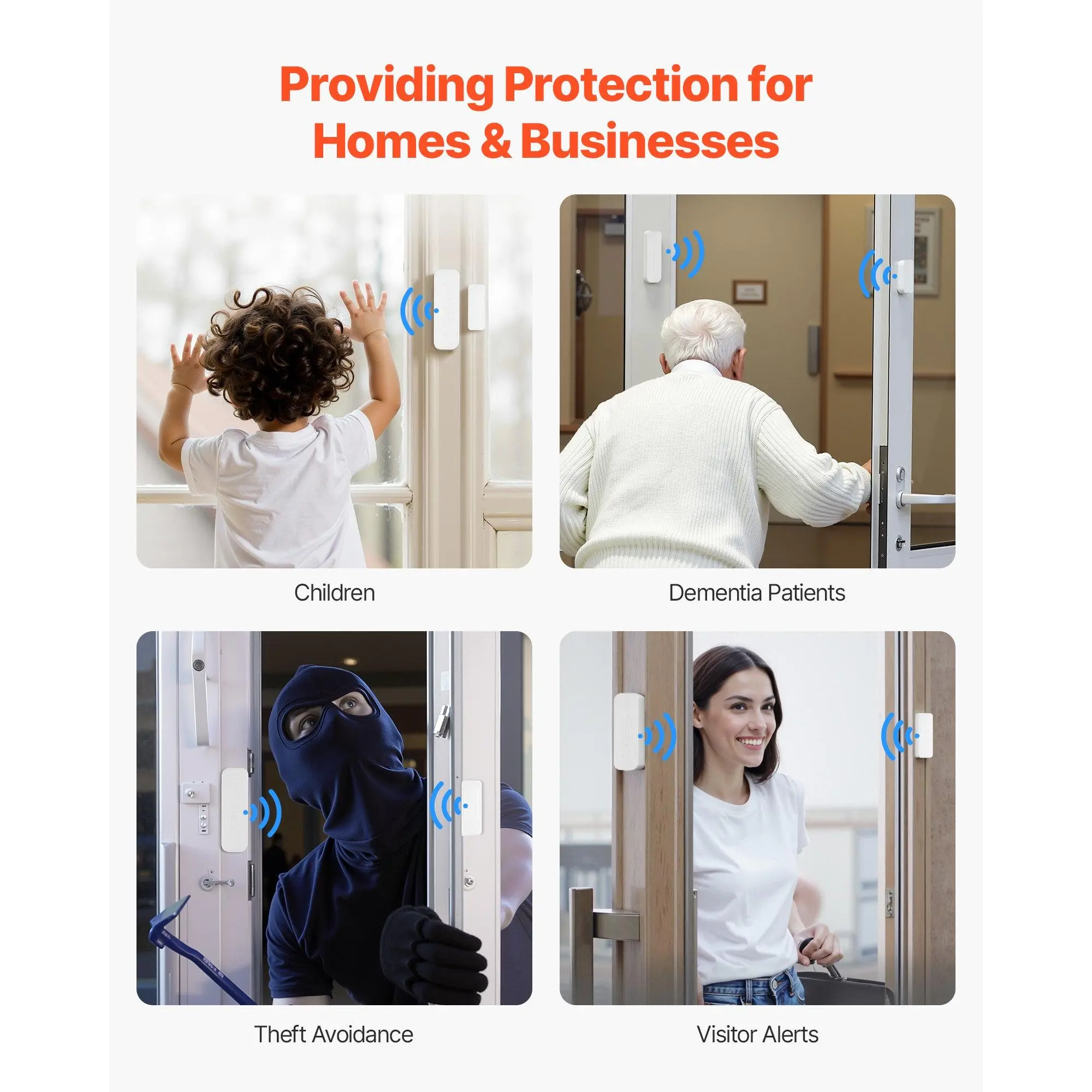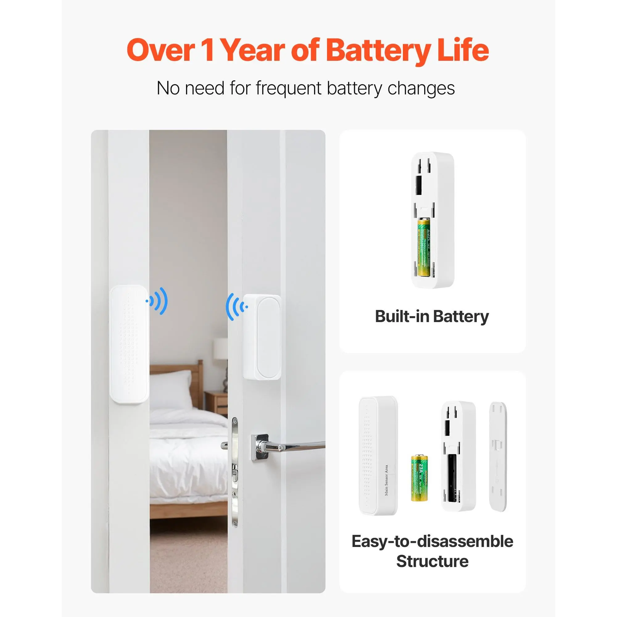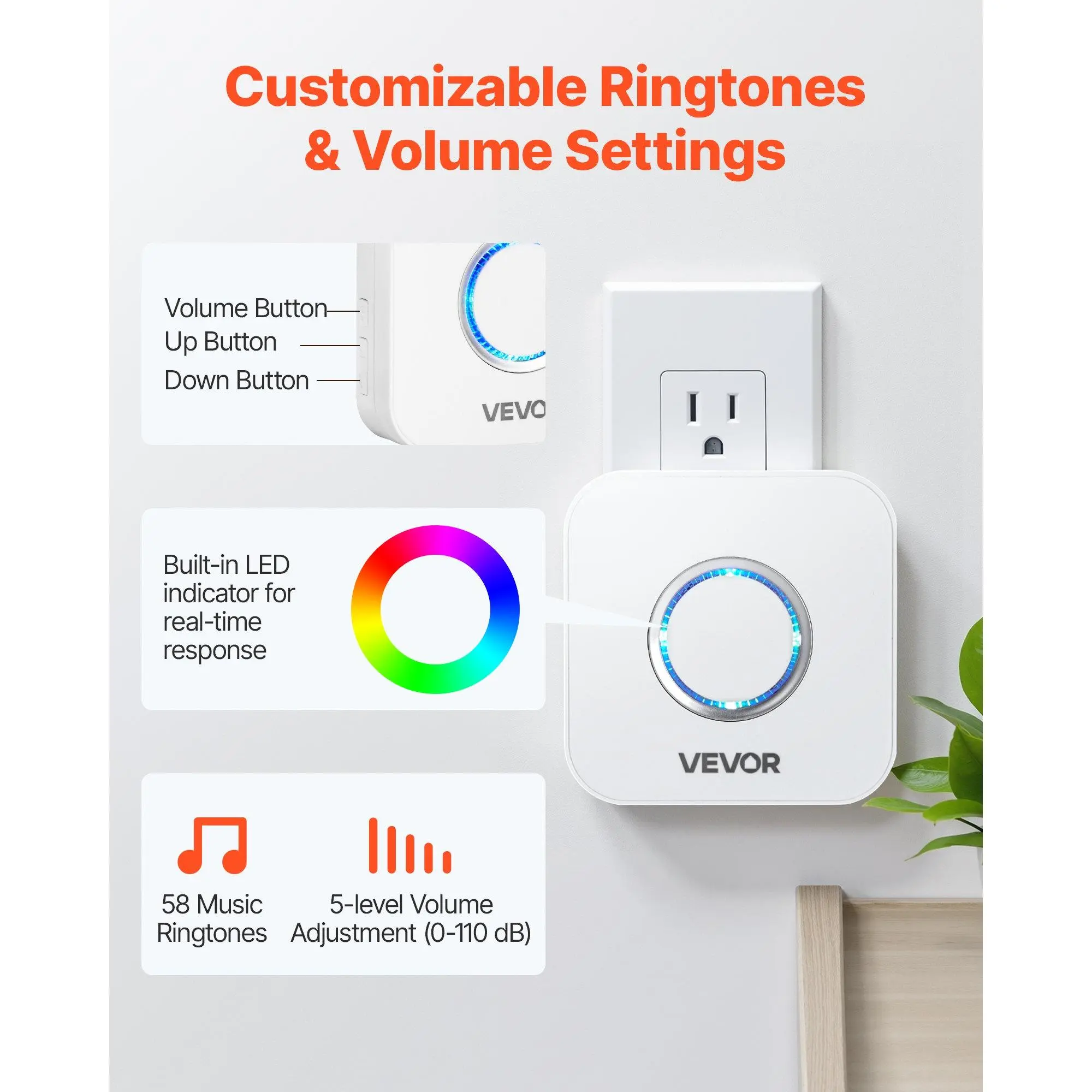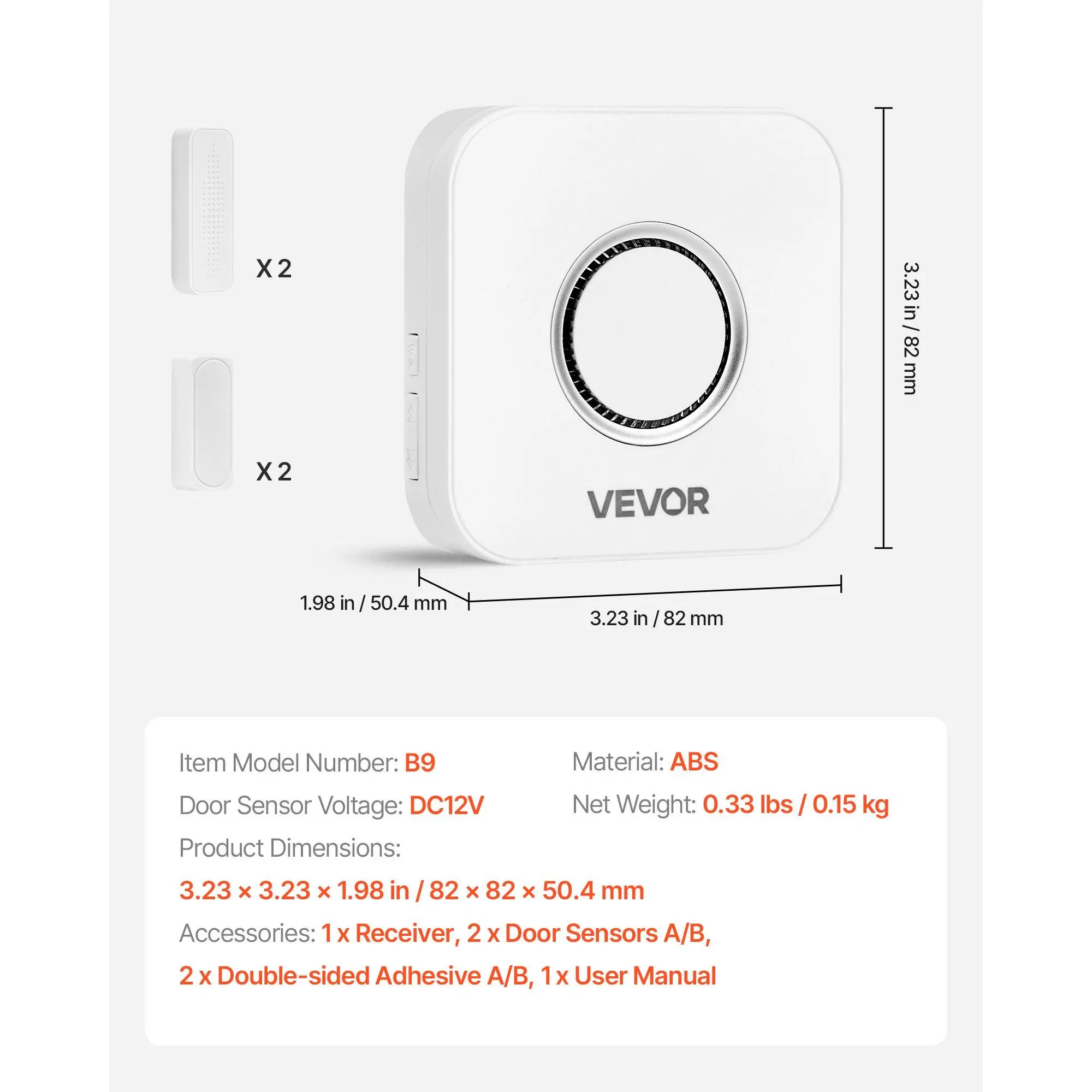 Long Range Transmission: This door sensor alarm features 1 receiver and 2 sensors, covering up to 656 ft / 200 m in open areas and 164 ft / 50 m through walls, ensuring full coverage and security for all your doors58 Customizable Ringtones: Enjoy 58 different ringtones with 5 adjustable volume levels (0-110 dB).Plus, the built-in LED indicator of our door sensor chime keeps you updated on device status, giving you the freedom to personalize your experienceEasy Installation: No tools needed!Simply stick the sensors on doors, windows, or drawers using the strong adhesive backing.Make sure the gap is under 0.8 inches for optimal performance.Not for doors with larger gapsLong Battery Life: The wireless door chime powered by an internal battery that lasts over 1 year, you won’t need to replace it often.Changing the battery is a breeze with its simple, tool-free design.Convenience at its bestVersatile Use: Ideal for avoiding break-ins, monitoring kids or elderly family members, and alerting you when customers arrive.This door open alarm keeps your space secure and ensures you're always in the knowVEVOR Door Chime, DC 12V, Wireless Door Open Contact Sensor Alarm Chime with 656 ft Range, 58 Chimes & 5 Adjustable Volume, Doors Ringer Alert for Business, Store, Home, Office When Entering