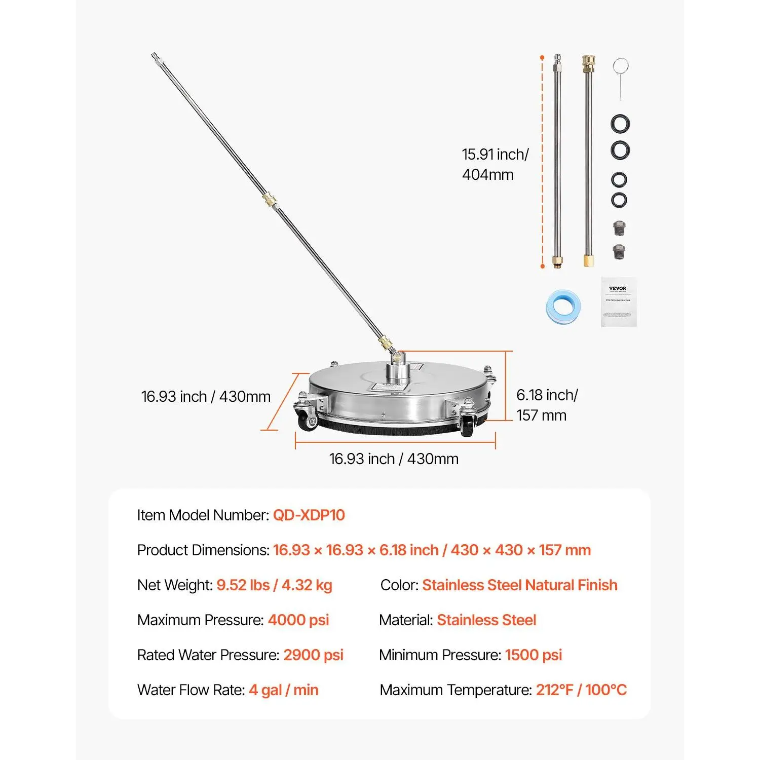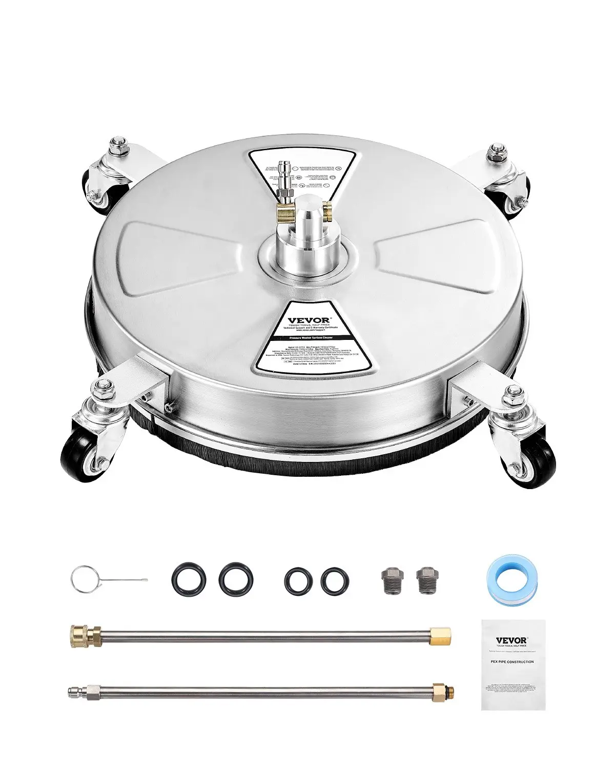 φ16.5 Inch Fast & Efficient Cleaning: With a high flow rate of 4 gal/min, this φ16.5-inch pressure washer surface cleaner ensures uniform coverage, leaving no spot behind.Whether it's a big task or regular cleaning, it makes the job easy.Enjoy efficient cleaning while saving time and effort.4000 PSI Powerful Pressure: With a rated pressure of 2900 PSI and a maximum pressure of 4000 PSI, the bottom 360° dual rotating nozzles quickly eliminate dirt and debris.No more struggling with tough stains.1/4" Quick Connect: Equipped with a standard 1/4-inch quick connector for seamless attachment.The connector is durable and secure, with a 180° rotating function for added maneuverability.Complete Coverage Cleaning: The smart brush design prevents splashback while ensuring a clean and comfortable work environment.The built-in rotating nozzles leave no corner untouched, occupying every inch of the surface with ease.Professional Accessories:This power washer surface cleaner comes with a variety of professional accessories, including hose connectors and an adapter kit for quicker assembly and immediate cleaning.Plus, a through-hole needle is included to easily solve any clogging issues.VEVOR 16.5" Pressure Washer Surface Cleaner, Stainless Steel Pressure Washer Attachments with 4 Wheels, 4000 Max PSI, 1/4 Quick Connector, 2 Spray Nozzles, 2 Extended Wands for Concrete, Patio, Deck