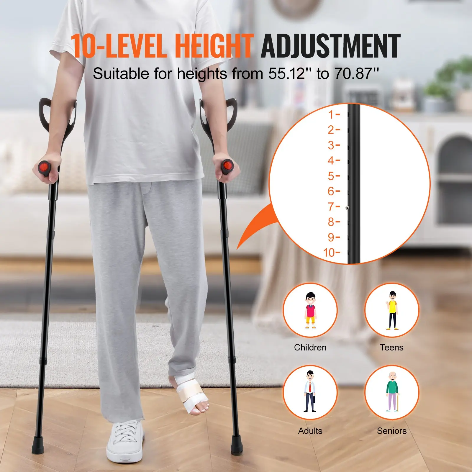 Reliable Walking Partner: VEVOR forearm crutches, crafted from durable aluminum alloy, support up to 350 lbs, ensuring stability and safety.Ideal for leg injuries, elderly, disabled, or post-surgical, alleviating your leg strain and restoring stable gaitComfort in Every Step: Our folding walking crutches offer multi-point support, U-shaped armrest, and ergonomic cuff to relieve pressure on elbow and arm, while relieving leg strain.Soft PP handle ensures a snug fit for a more enjoyable walking experienceStepless Adjustable Height: Featuring 10-level height adjustment, this medical support crutches accommodates different heights, from 55.12" to 70.87".Whether for daily walking or extra support, it offers a customizable fit, ensuring reliable assistanceSecure and Non-Slip: Our rubber, non-slip foot pads offer superior stability and ground contact on uneven surfaces, offering enhanced traction and full weight support.It absorbs shock, minimizes impact on joints, allowing you to walk stably and safelyVersatile Application: Ideal for hospital, home, rehabilitation center, and public space, our forearm crutches for adults provide essential mobility assistance.Detachable, foldable, and lightweight, it is easy to carry and store without taking up spaceVEVOR Forearm Crutches for Adults, Folding Walking Forearm Crutches with 10-Level Adjustable Height, Lightweight Aluminum Medical Crutches with Open Cuff for Leg Injury Surgery Disabled, 1 Pair 350LBS