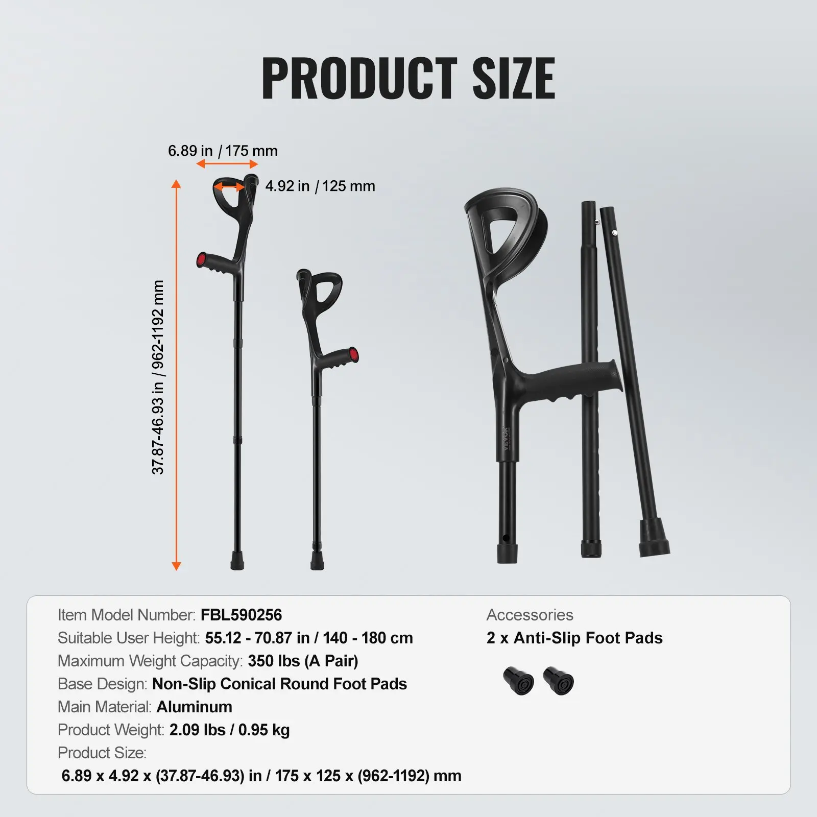 Item Model Number: FBL590256,Product Weight: 2. 09 lbs / 0. 95 kg,Base Design: Non-Slip Conical Round Foot Pads,Maximum Weight Capacity: 350 lbs (A Pair),Suitable User Height: 55. 12 - 70. 87 in / 140 - 180 cm,Main Material: Aluminum,Product Size: 6. 89 x 4. 92 x (37.. 87-46. 93) in / 175 x 125 x (962-1192) mm