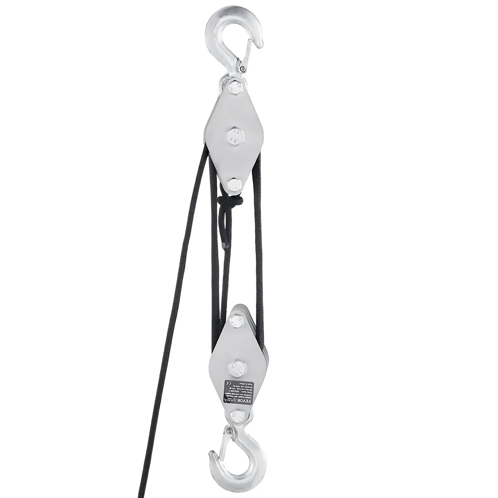 Long Rope Reach: Equipped with 100 feet of durable rope, this rope hoist pulley system comes with 6mm high-quality polyester rope that is wear-resistant and tear-resistant.It's ideal for lifting in a variety of settings, such as garages, campsites, boats, construction sites, hunting, tree cutting, or attics.The rope’s strength ensures efficient lifting at different heights, making heavy lifting a whole lot easier.Heavy Lifting Power: Each rope hoist features a set of three metal pulleys and strong rope, capable of lifting up to 4400 lbs (2T).With a recommended working load of 1100 lbs (500 kg), you can easily tackle heavy lifting tasks like raising animals, trees, furniture, bikes, motorcycles, and toolboxes.Tested for reliable performance, it’s your go-to for effortless lifting.Efficient Lifting Ratio: Forget about straining your back!This pulley system has a 5:1 lifting ratio, meaning you only need 1/5 of the usual effort to lift heavy items.It saves your energy and protects your back from strain, making it a thoughtful gift for friends or family who need help with lifting.Durable Steel Construction: Built tough, this pulley lift system uses high-strength galvanized steel for the housing and pulleys, with a rust-resistant finish to withstand heavy use.The forged locking hooks add extra durability, while the reinforced side panels avoid any twisting or bending.Trust this hoist to be your reliable partner for all lifting needs.Easy Setup & Storage: No hassle here!The rope pulley system comes pre-assembled, so you can start using it right out of the box.Say goodbye to tangled ropes and accessories.Plus, with two 18-inch soft loop straps to secure large items and a handy storage bag to keep everything neatly packed, you’ll have everything you need, right where you need it.VEVOR 4400 lbs Breaking Strength 100 FT Rope Pulley Hoist, 5:1 Lifting Power Heavy Duty Pulley System with 2pcs Soft Loops, Metal Wheels Bearing Structure, Block and Tackle for Lifting Heavy Objects