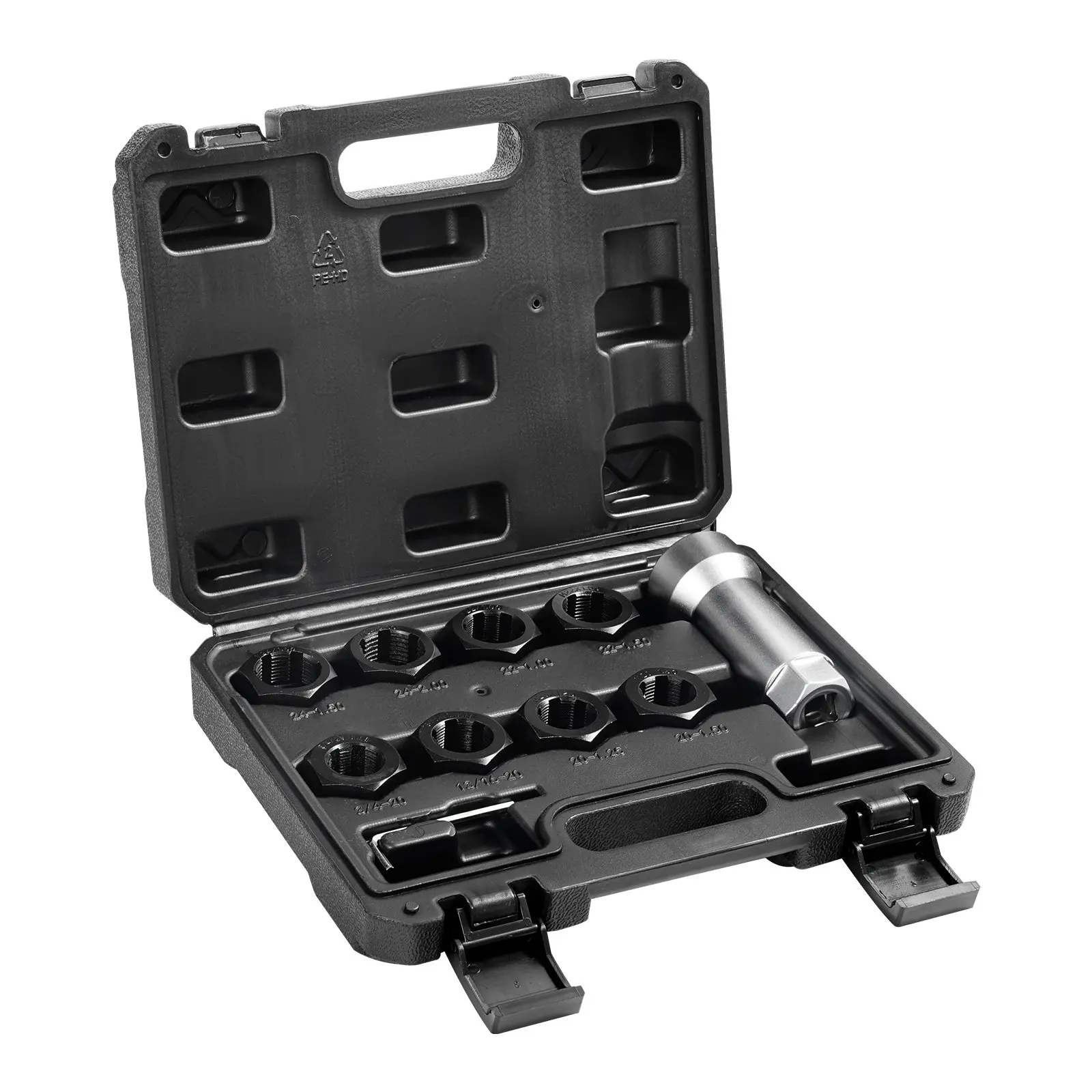 Built to Last: Our axle spindle thread chaser set is made from 40CR steel, with an electroplated and blackened surface finish, hardened to HRC 45-55.This ensures outstanding durability and corrosion resistance under tough conditions, making it ideal for professional repairs and industrial applications.Complete Size Range: The axle spindle rethreading tool kit includes M20 x 1.25, M20 x 1.50, M22 x 1.00, M22 x 1.50, M24 x 1.50, M24 x 2.00, 13/16 inch x 20 UNF, 3/4 inch x 20 UNF, and a 27mm extension bar.Perfect for cleaning or repairing spindle threads, axle studs, and wheel stud threads.Internal Slot Design: Our thread chaser kit is precisely engineered for a perfect fit.It features vertical grooves along the radial threads, providing a channel for metal debris to exit during cleaning and repair, ensuring a smoother rethreading process.Easy Operation: The extension bar of the thread restorer kit ensures stable and aligned thread engagement while working with a ratchet or socket wrench (not included), enabling accurate and smooth thread repair.Convenient Storage Case: The thread repair kit includes a carry case to keep all your thread repair tools neatly organized and allows for easy transport between jobs, ensuring a hassle-free experience.VEVOR 10-Piece Axle Spindle Thread Chaser Set, Metric M20 M22 M24 and UNF 13/16" 3/4" Thread Restorer Tool, Rethreading Tool Kit with Extension Bar, Hex Wrench, Storage Case, for Damaged Axle Spindles